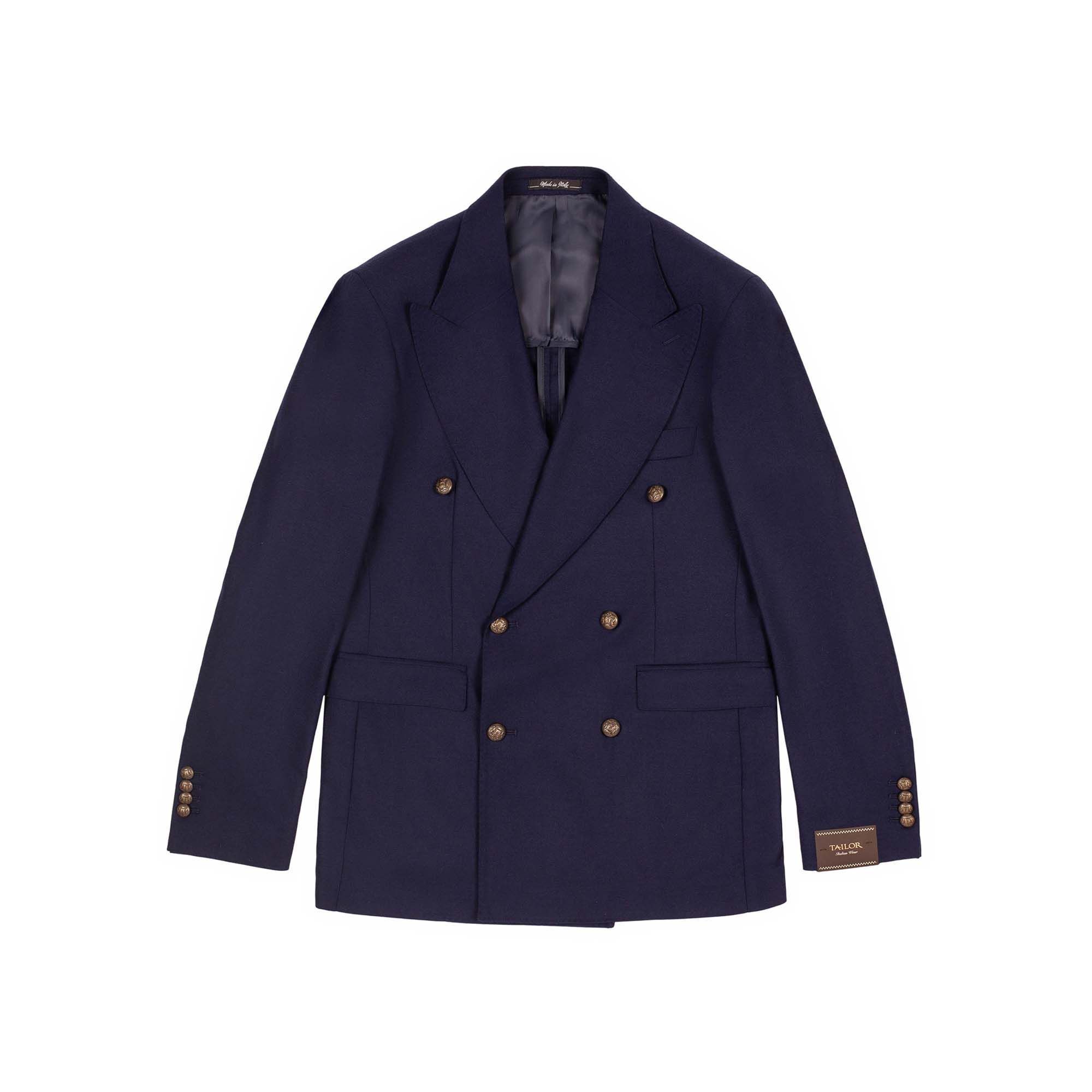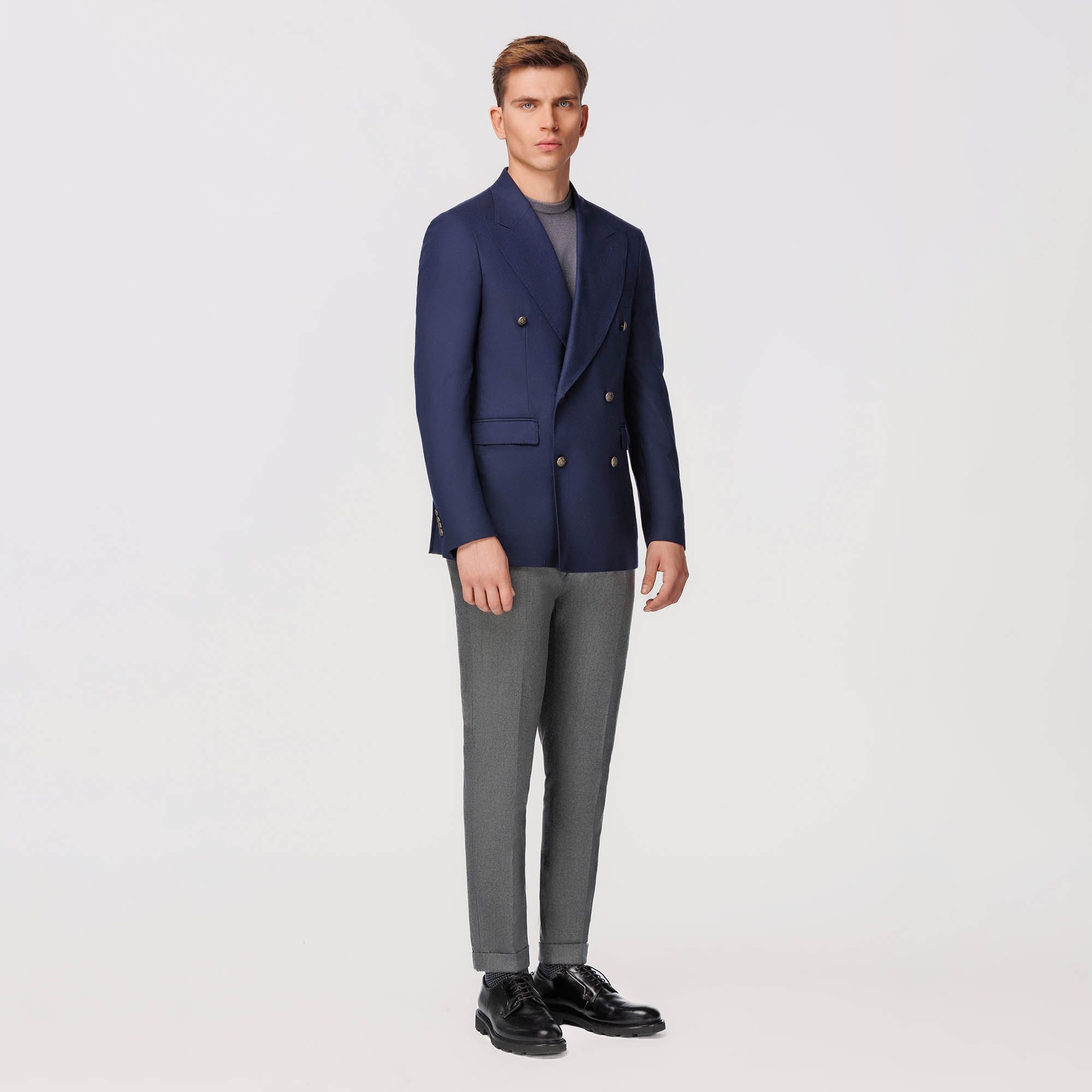 This is a double breasted blazer designed to fit sharply in an impeccable manner, crafted from a three dimensional elasticized wool and cashmere fabric in a light flannel effect.