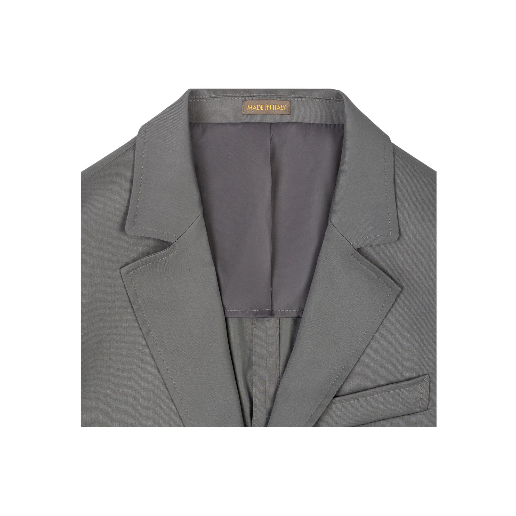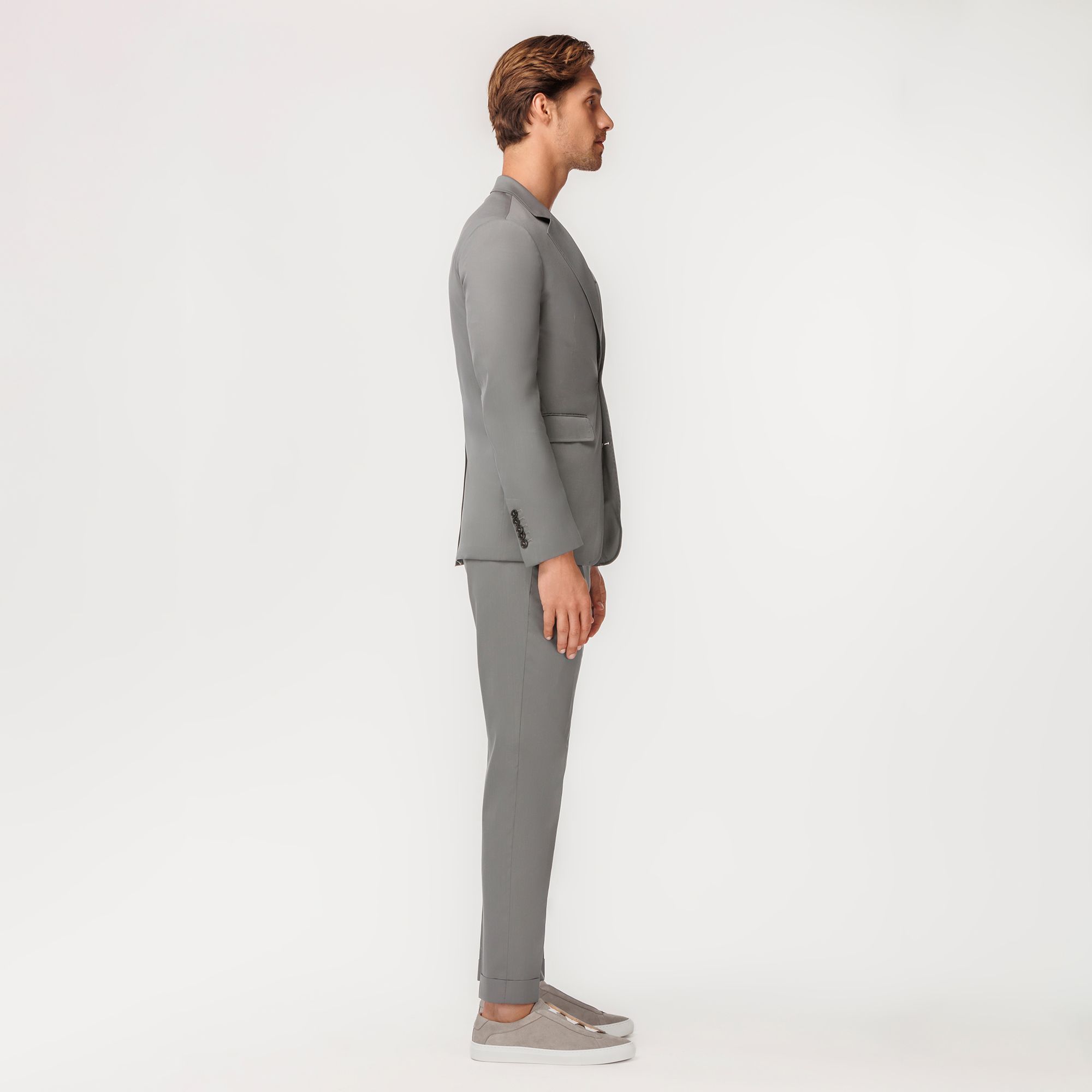 A suit that is crafted from virgin wool with the insertion of polyamide that grants technical touch, a three dimensional luminous aspect and a natural two tone effect. The blazer is half lined with natural feel shoulders and working sleeve buttonholes, while trousers and single pleated with a comfortable tapered fit.