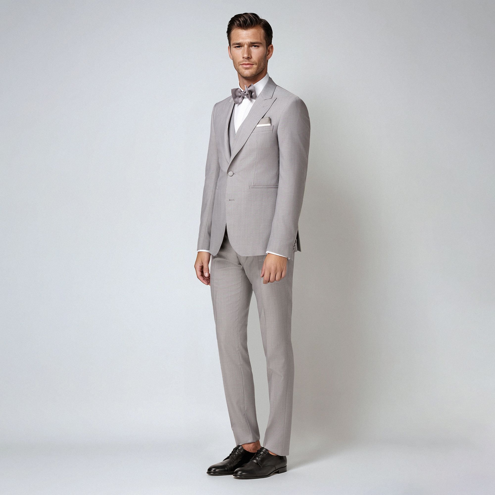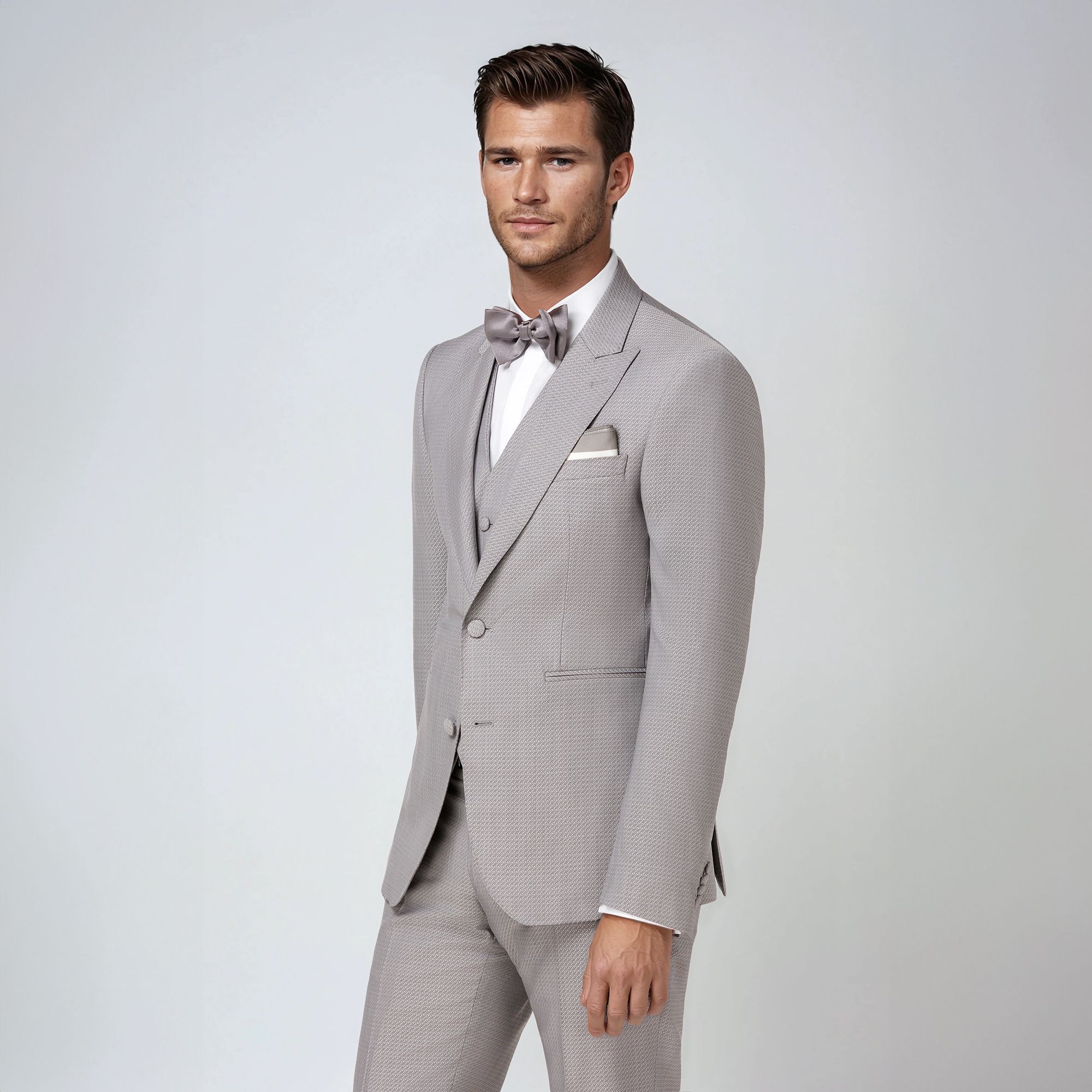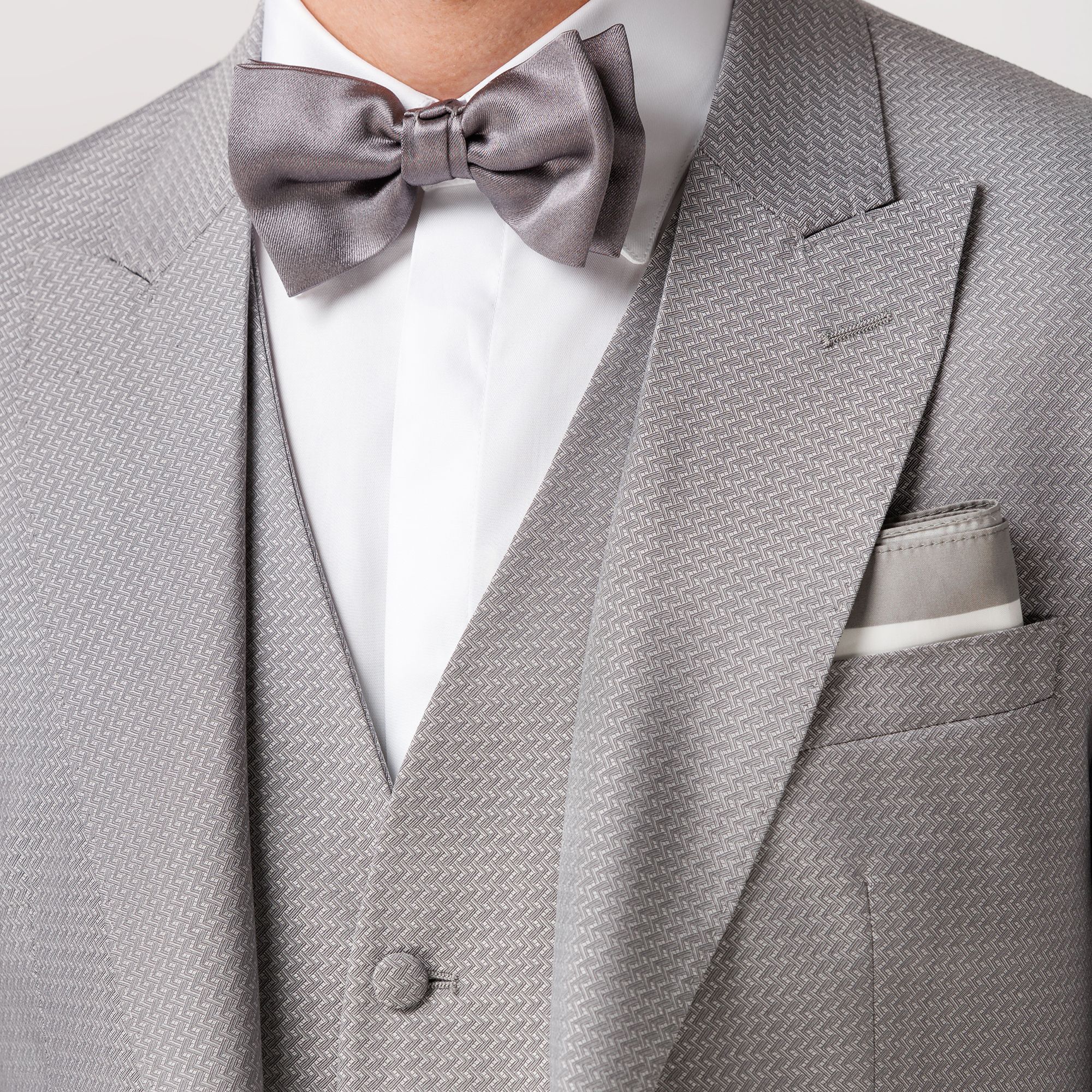 Contemporary total look with grey three-piece suit, matching vest and bow tie. Perfect for formal events or elegant summer weddings.