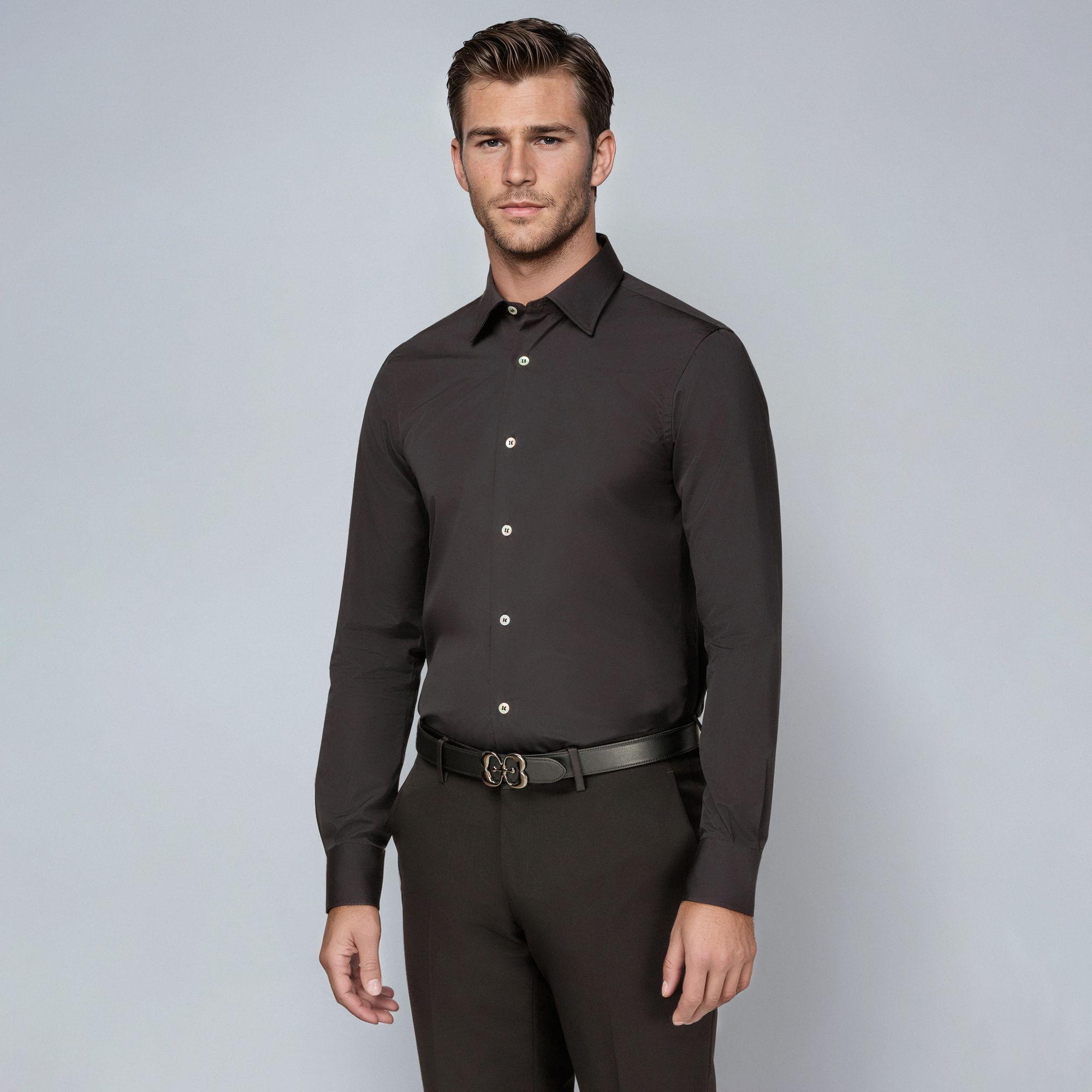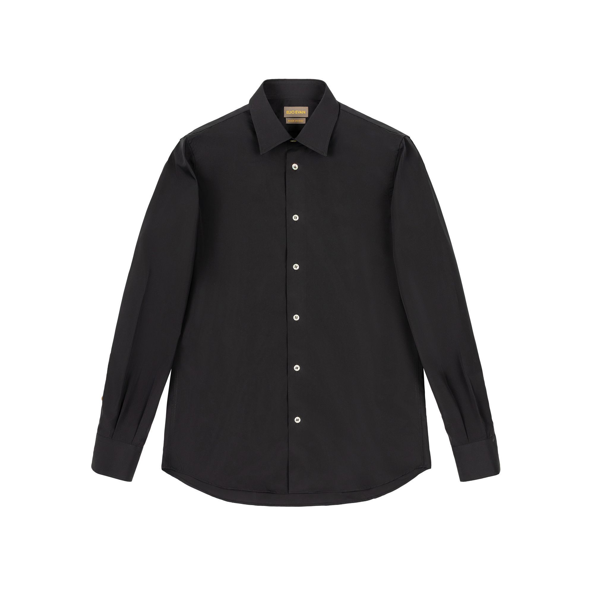 Refined men’s shirt crafted from black cotton popeline 120/1, in the Ralph model with Italian collar and custom fit silhouette. Detailed with mother-of-pearl buttons, removable stays, and single-needle stitching, it embodies timeless elegance with Elio Evan’s signature fit. An essential piece for formal and evening occasions.