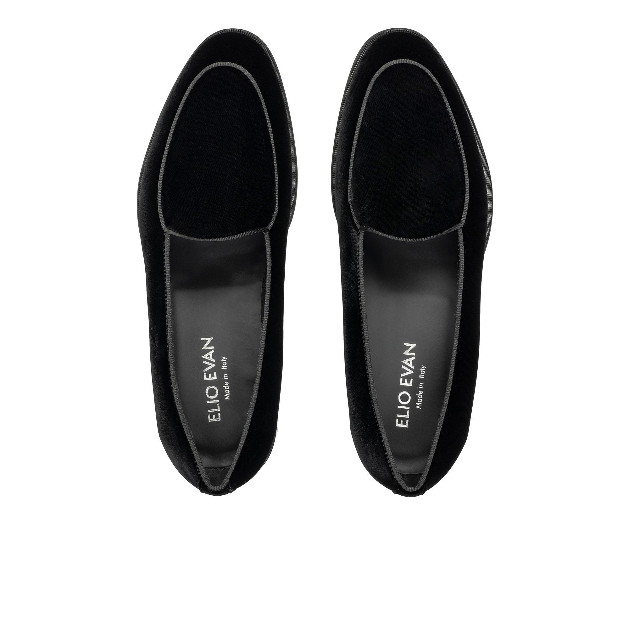 Elio Evan reimagines the timeless evening loafer in a refined black velvet interpretation. Crafted in Italy and designed for tuxedo ensembles or elegant dinner attire, this slip-on blends softness and structure with effortless poise. The upper, cut from luxurious cotton-silk velvet, catches light with subtle depth, while a grosgrain-trimmed topline and almond toe create a clean, distinguished silhouette. Inside, a smooth full-grain leather lining ensures breathable comfort through long formal events. The Blake-stitched leather sole offers flexibility, lightness, and the discreet confidence expected of fine Italian craftsmanship. A sophisticated alternative to lace-ups, this velvet loafer embodies the understated luxury of the Elio Evan man—elegant, modern, and quietly confident.