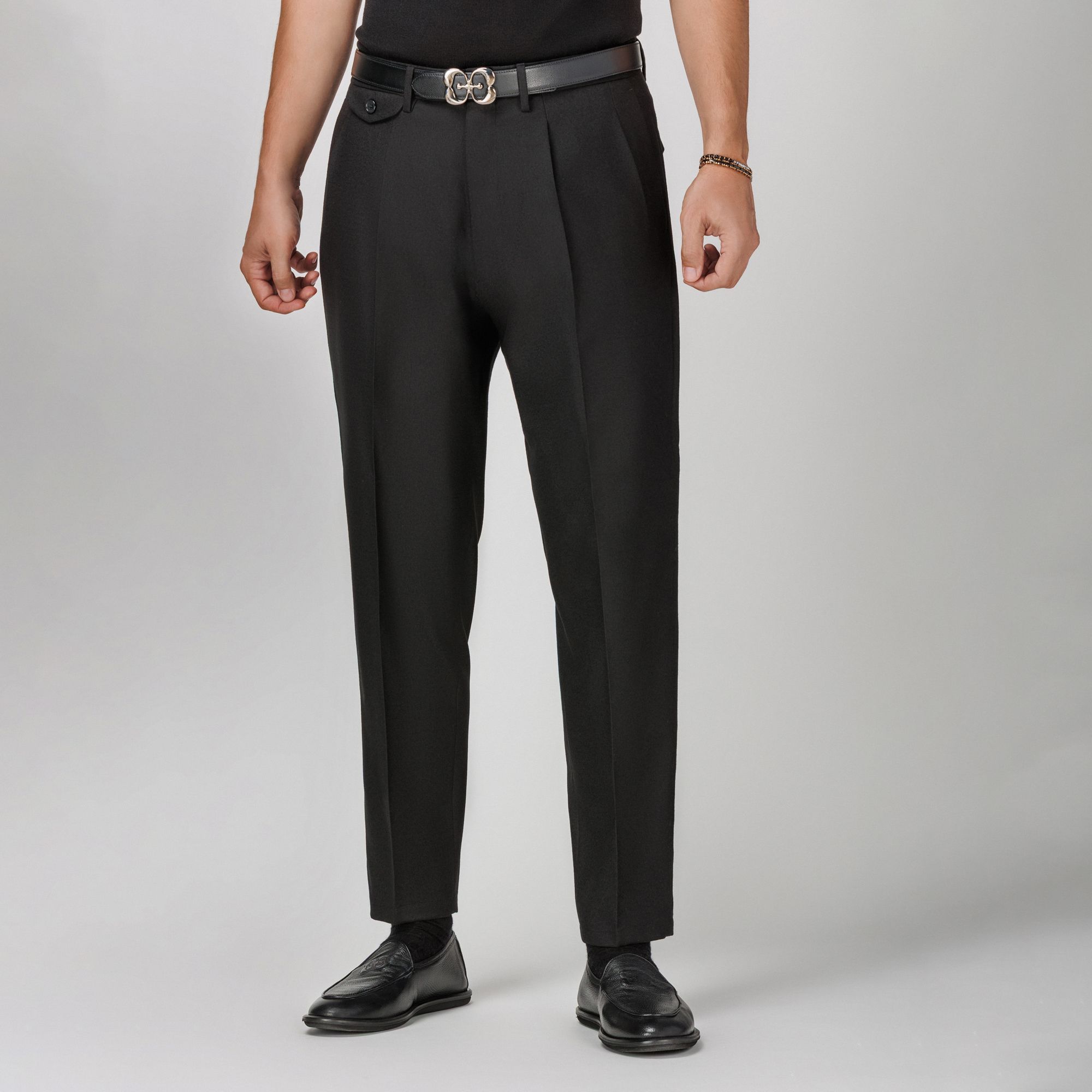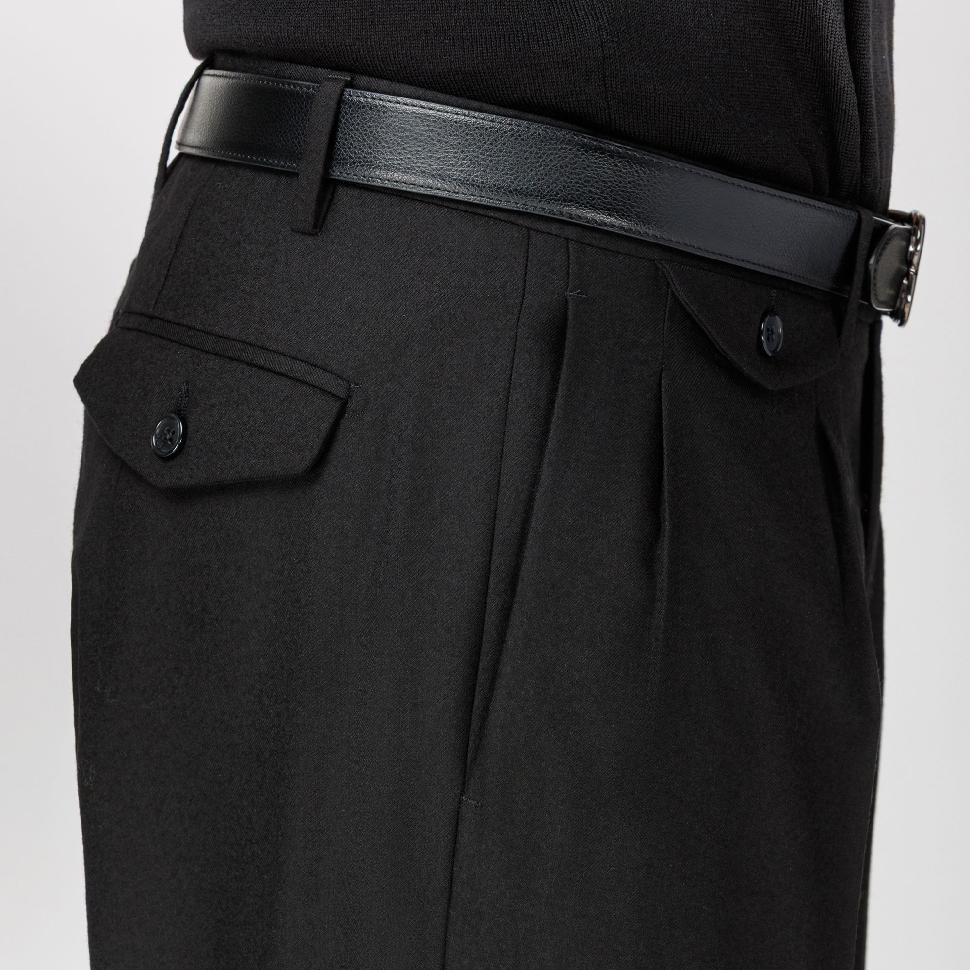 Men’s black flannel pants in a refined wool blend, offering elegance with everyday performance. The Japan model features a wide structured fit with double front pleats, flap pocket detailing, and a clean waistband finish. Washable, wrinkle resistant, and versatile, these pants combine comfort with Elio Evan’s signature flawless fit. Suitable for both elegant occasions and casual styling.