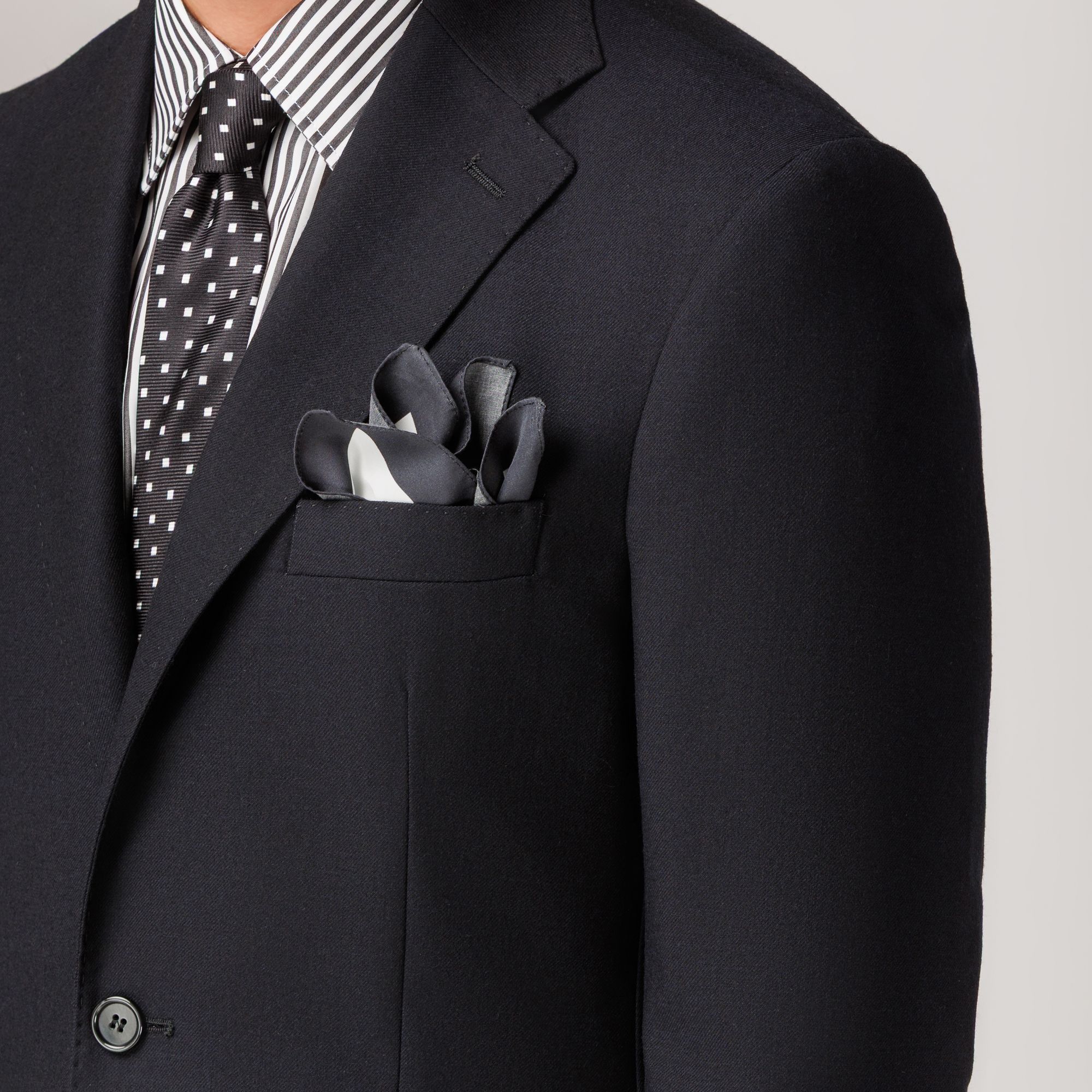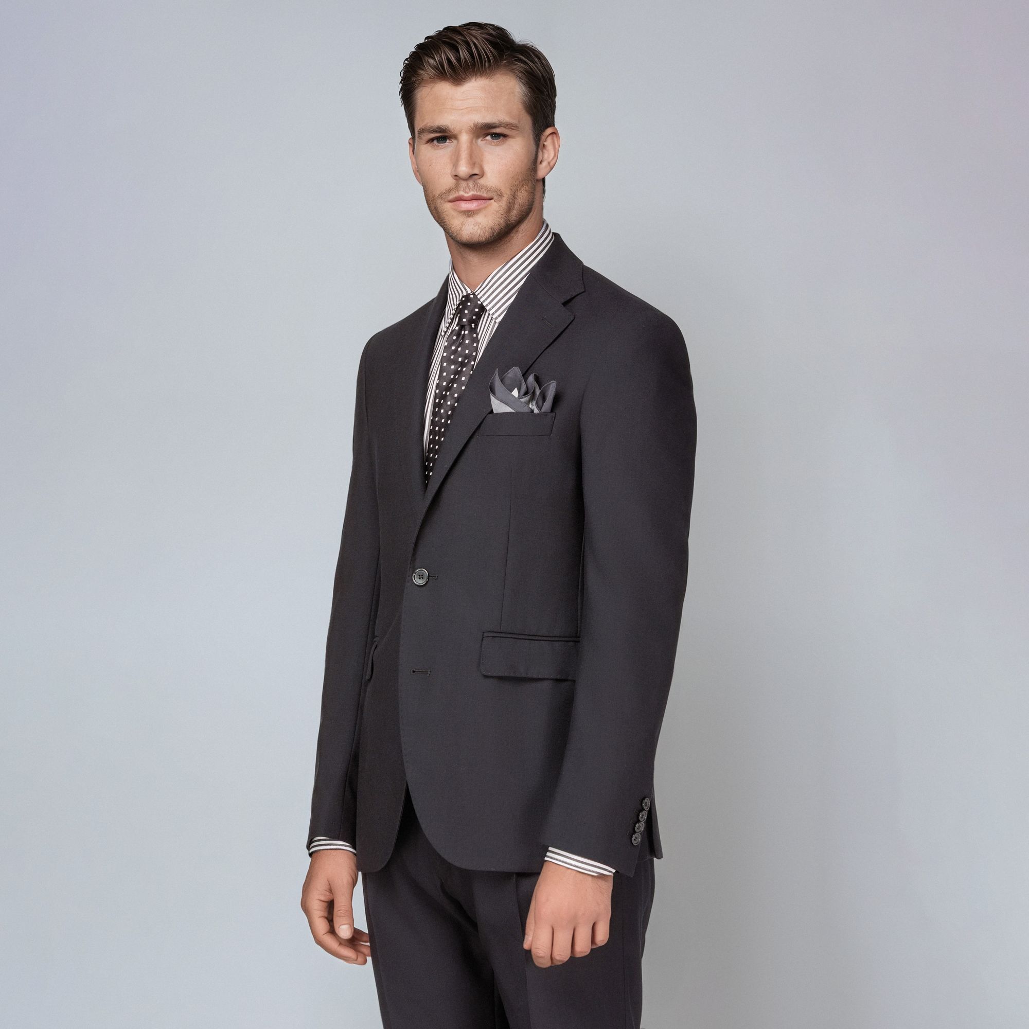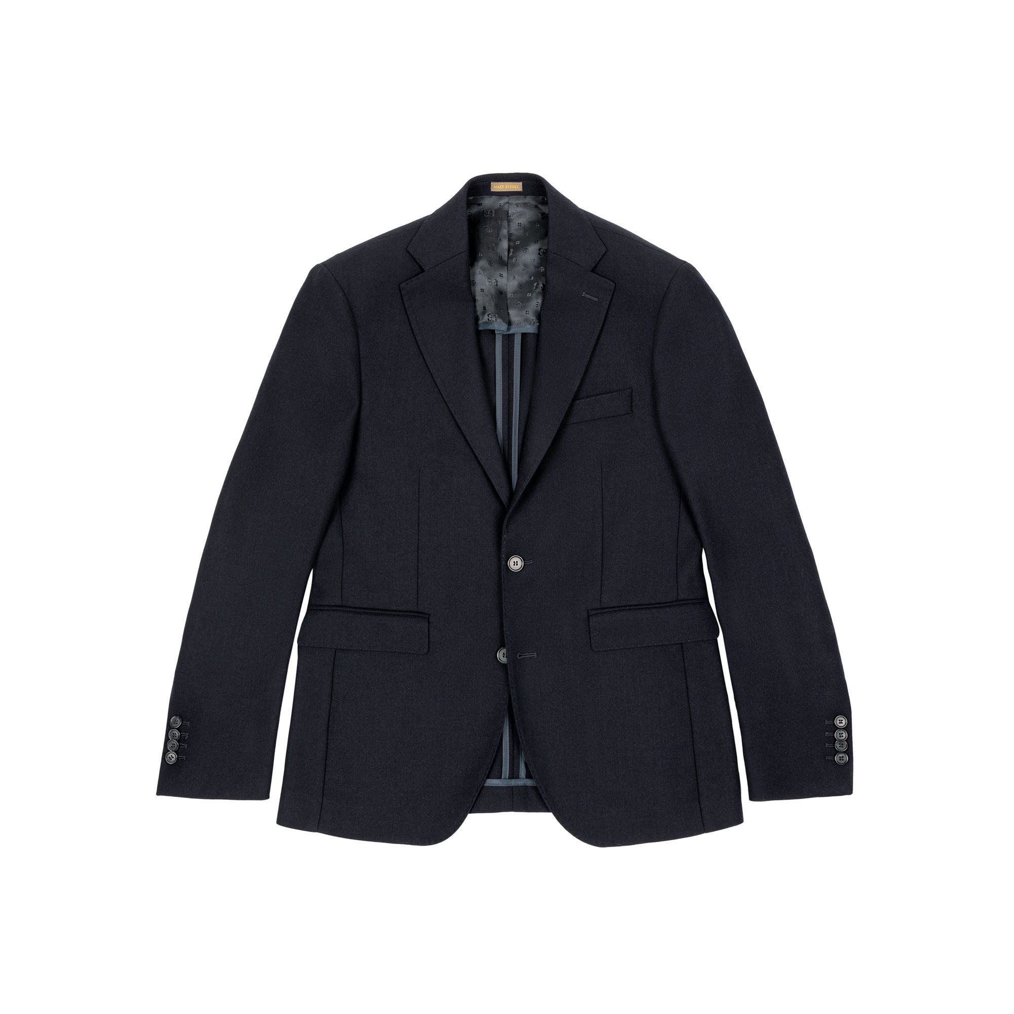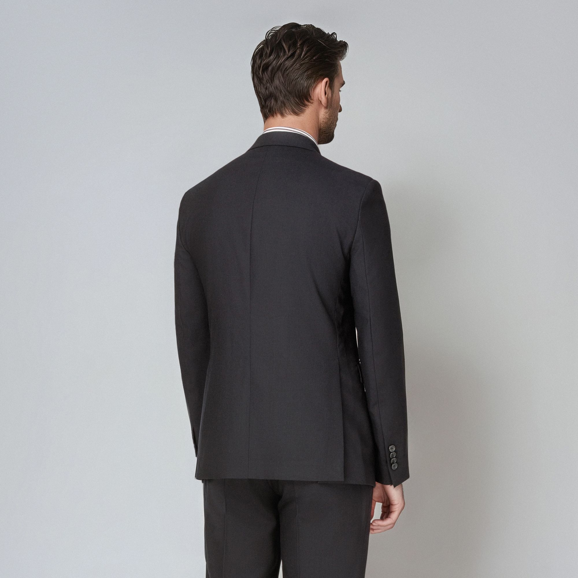 Sophisticated men’s black blazer in 100% virgin wool crepe with a subtle brushed finish that enhances texture and depth. The Vomero G model reflects Elio Evan’s Italian tailoring philosophy with natural shoulders, AMF-stitched notch lapels, and a half-lined construction for contemporary ease. A versatile men’s blazer for formal and smart-casual looks, also available in charcoal grey and navy blue. Part of Suit separate collection.