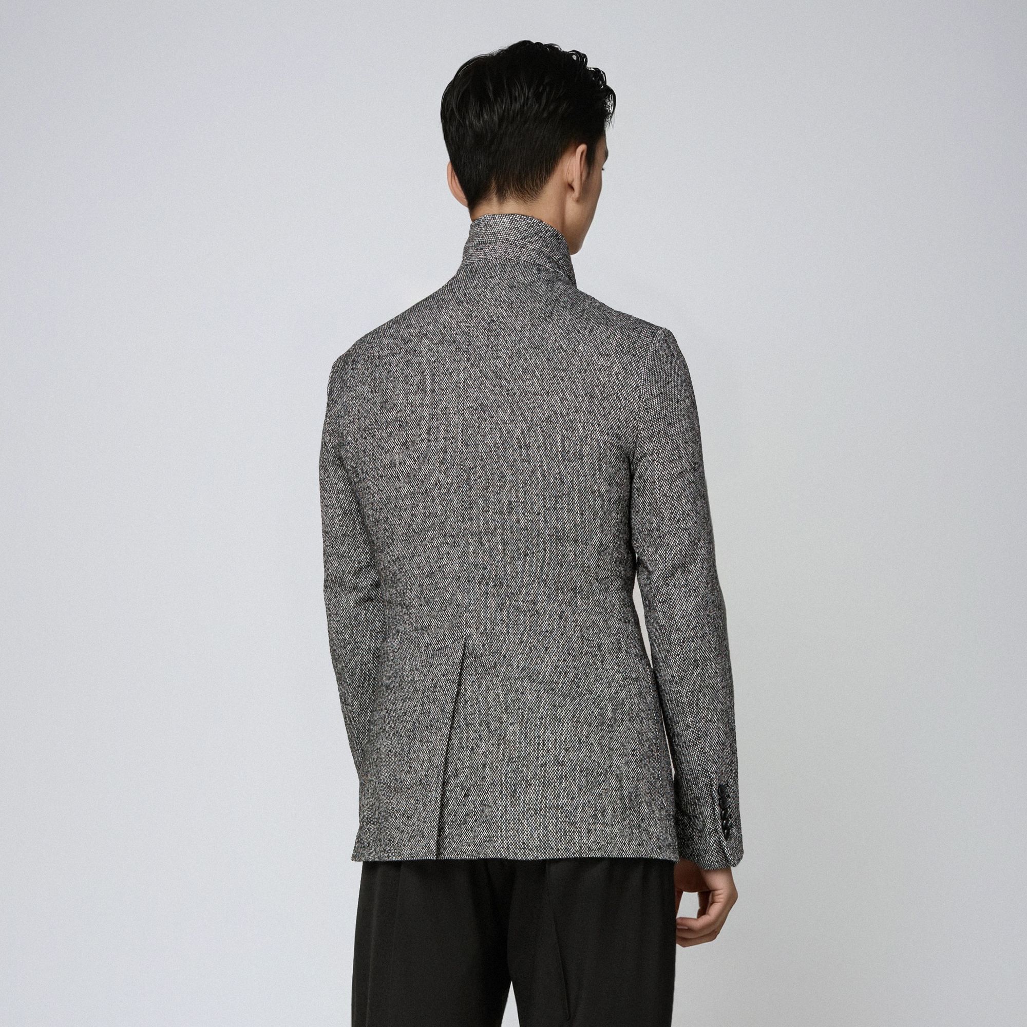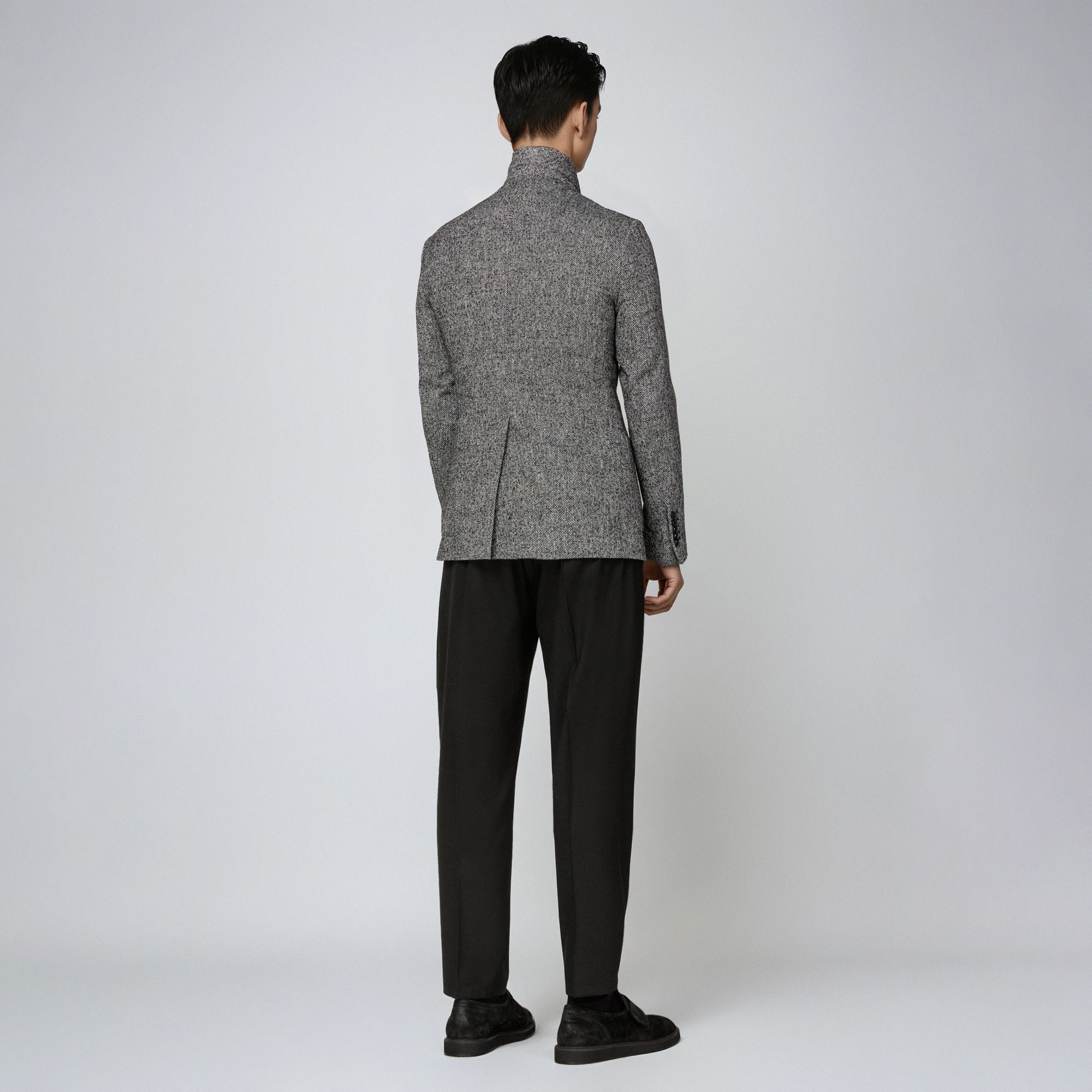 A refined men’s sport jacket in bouclé wool blend (black–grey mélange), tailored in the house’s Tokyo model — a versatile design that can be worn buttoned as two, three, or four, including the elevated guru configuration. Its three-dimensional bouclé texture creates depth and movement, balancing a sporty attitude with understated Italian elegance. Half-lined with the Elio Evan signature lining, it features patch pockets, AMF stitching, bordered internal seams, and a single back vent within an unstructured yet precise silhouette. Fabric and manufacture Made in Italy.