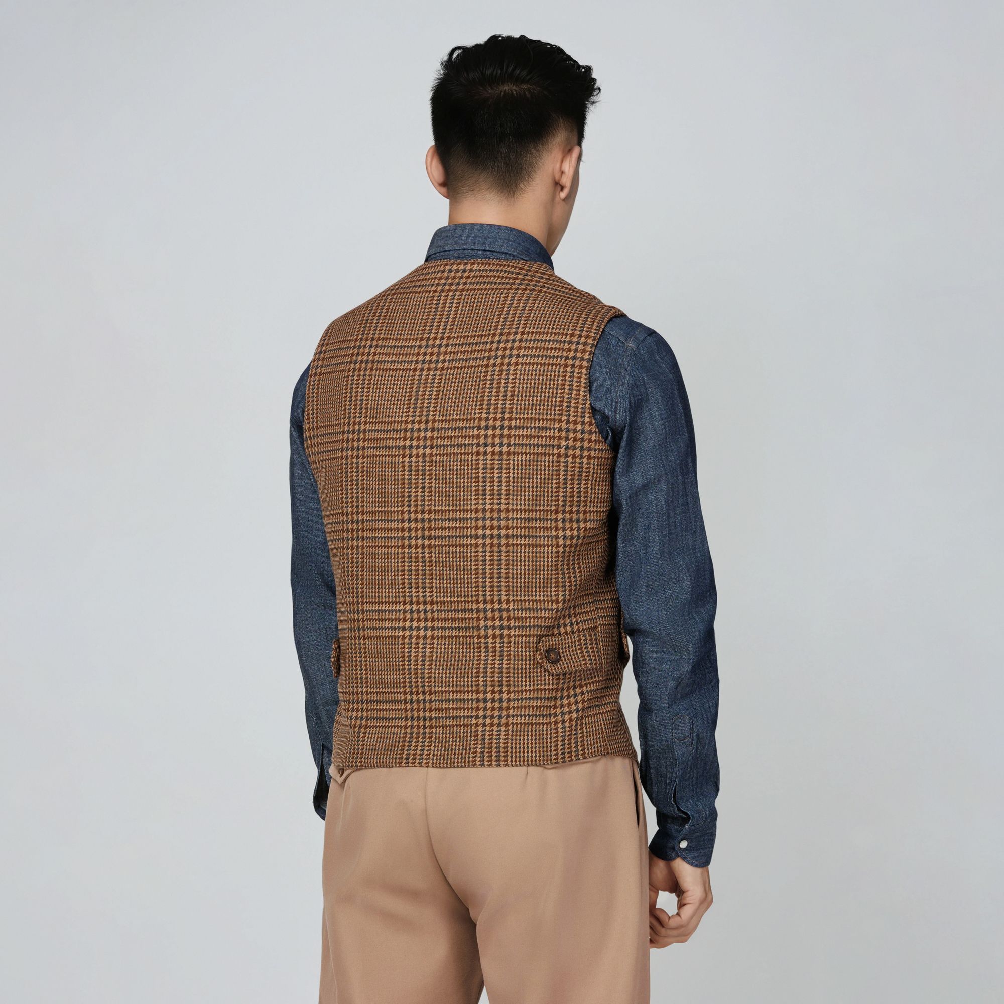A refined men’s checked waistcoat in Caffè au lait brown, crafted from 100% Italian fabric in a premium blend of virgin wool and cotton. The Armour model by Elio Evan combines classic tailoring with modern lightness — featuring the same fabric on front and back, two flap pockets, and adjustable side tabs for a perfect fit. Lined for comfort and effortless wearability, it’s designed to pair elegantly with the matching blazer, expressing pure Italian craftsmanship.