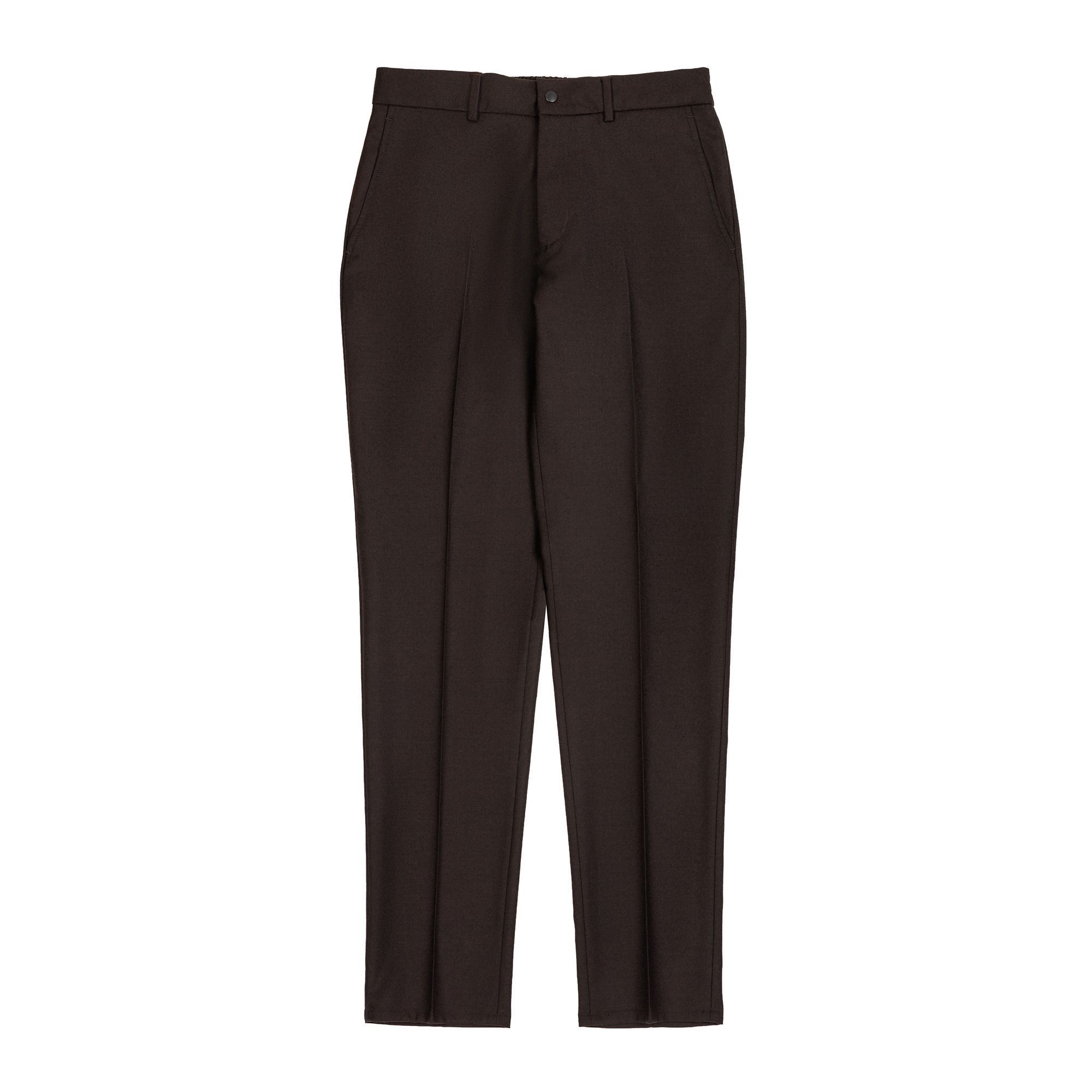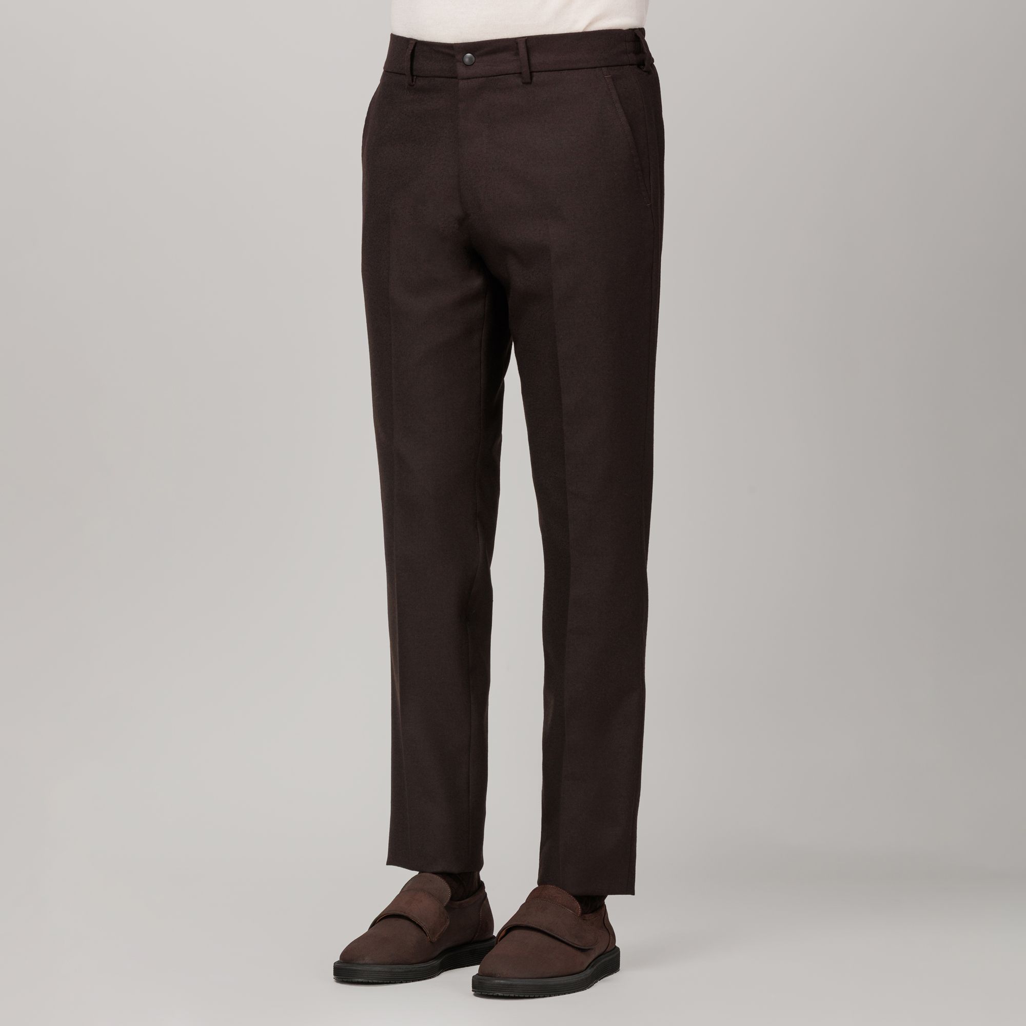 Men’s brown trousers in soft flannel crafted from a refined stretch wool blend with easy-care performance. Designed with a flat front and elasticized back waistband for modern comfort, they feature a button and snap closure, oblique pockets, and internal lining for a polished yet relaxed finish. Equipped with belt loops and pressed front creases, they transition effortlessly from semi-formal to casual settings — a contemporary expression of Elio Evan’s refined practicality.