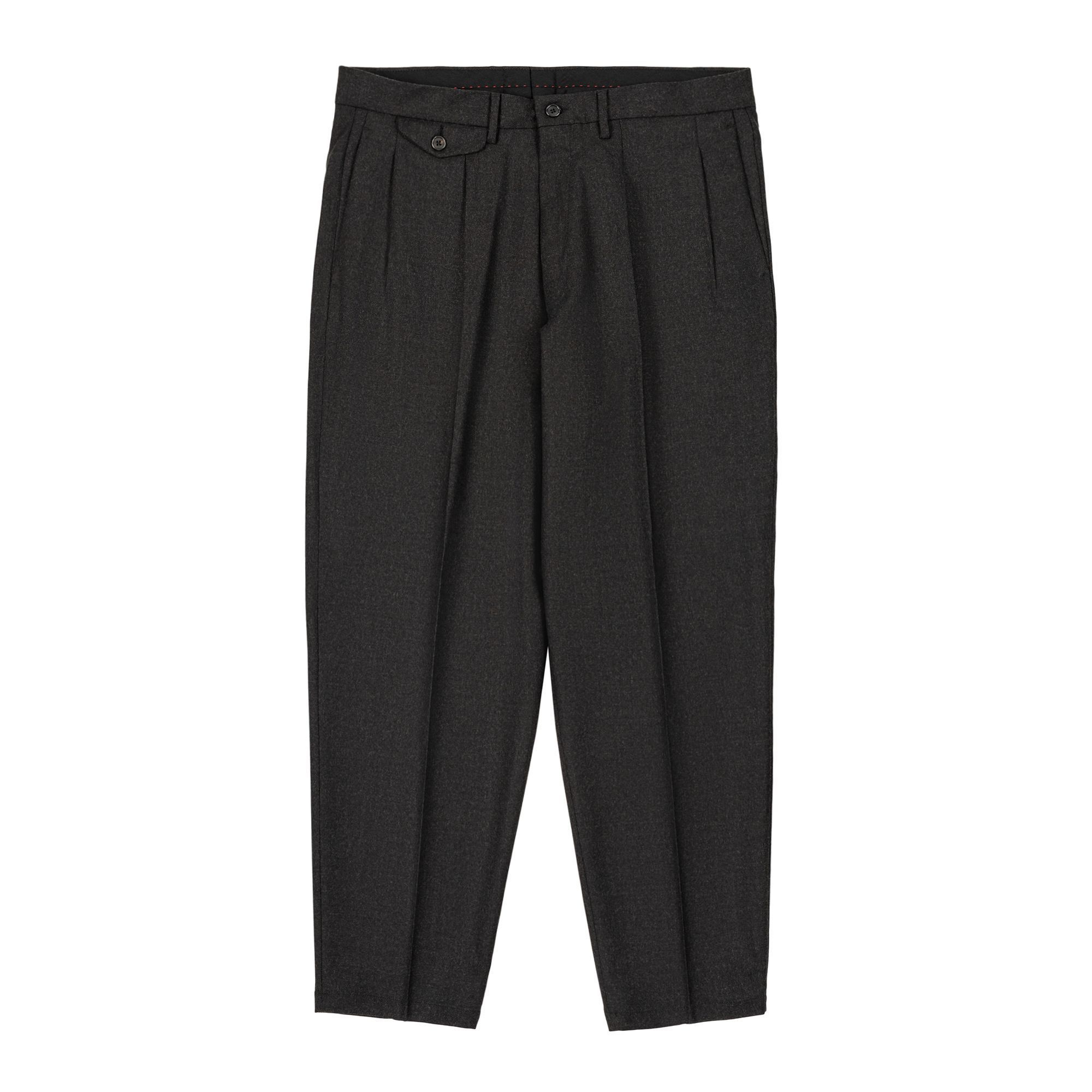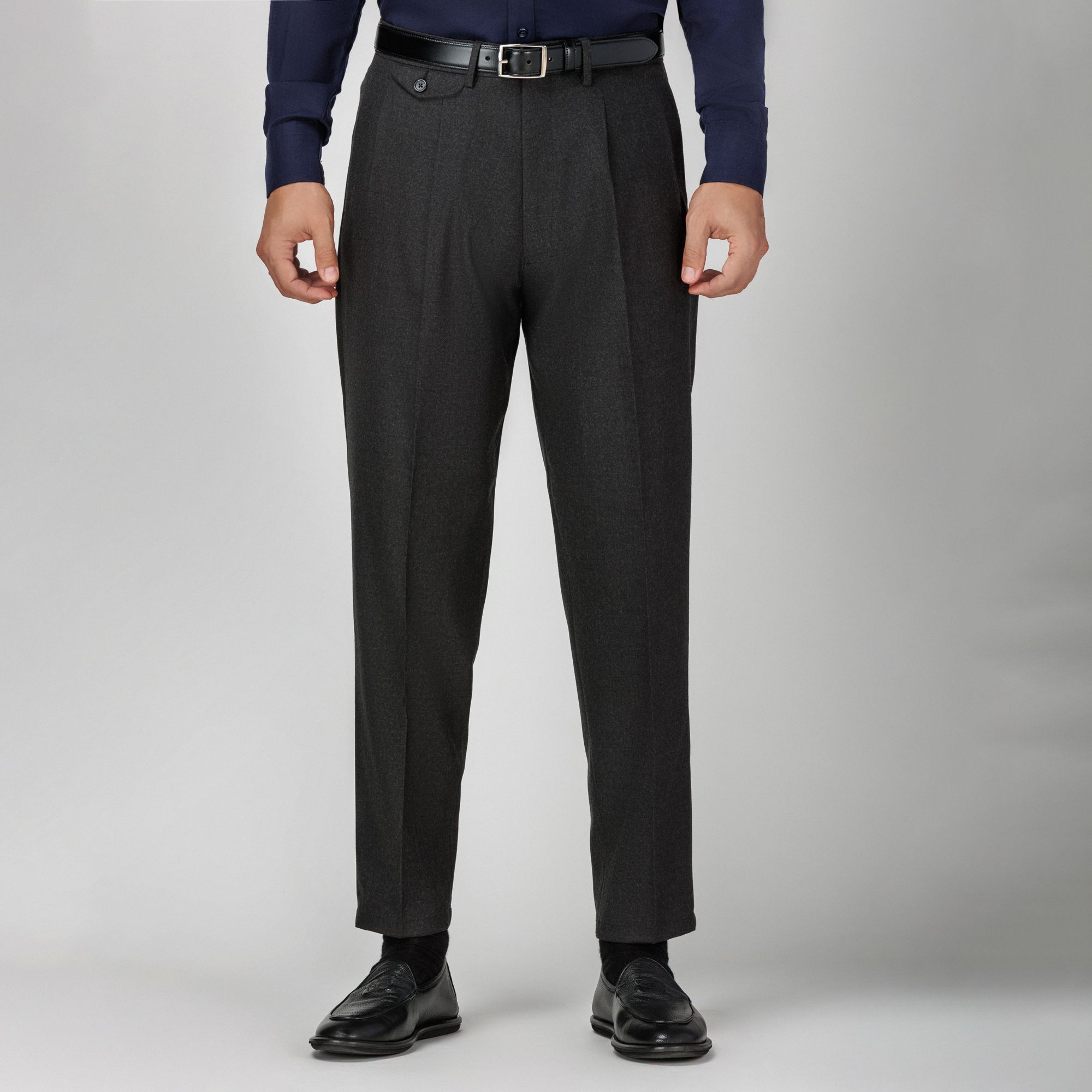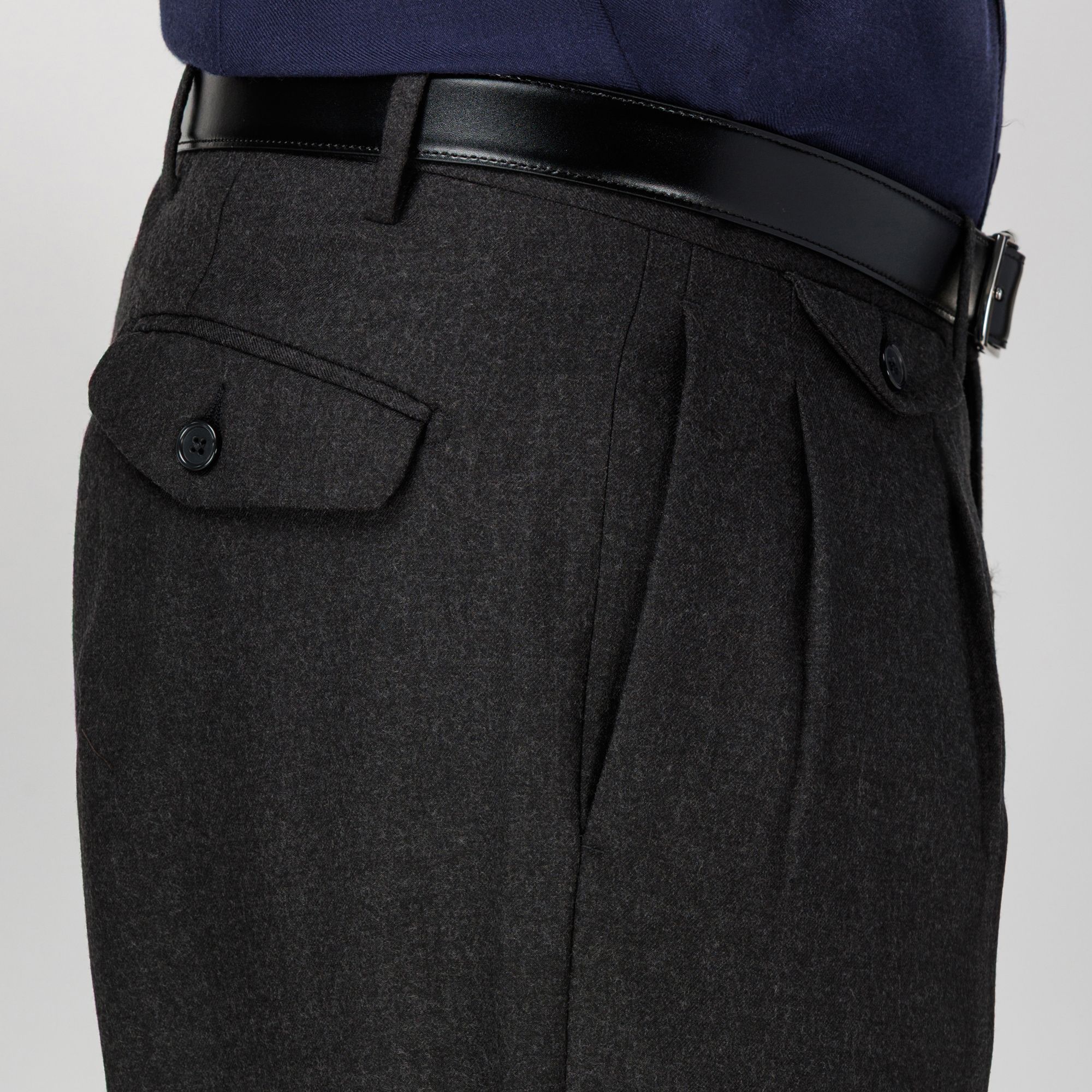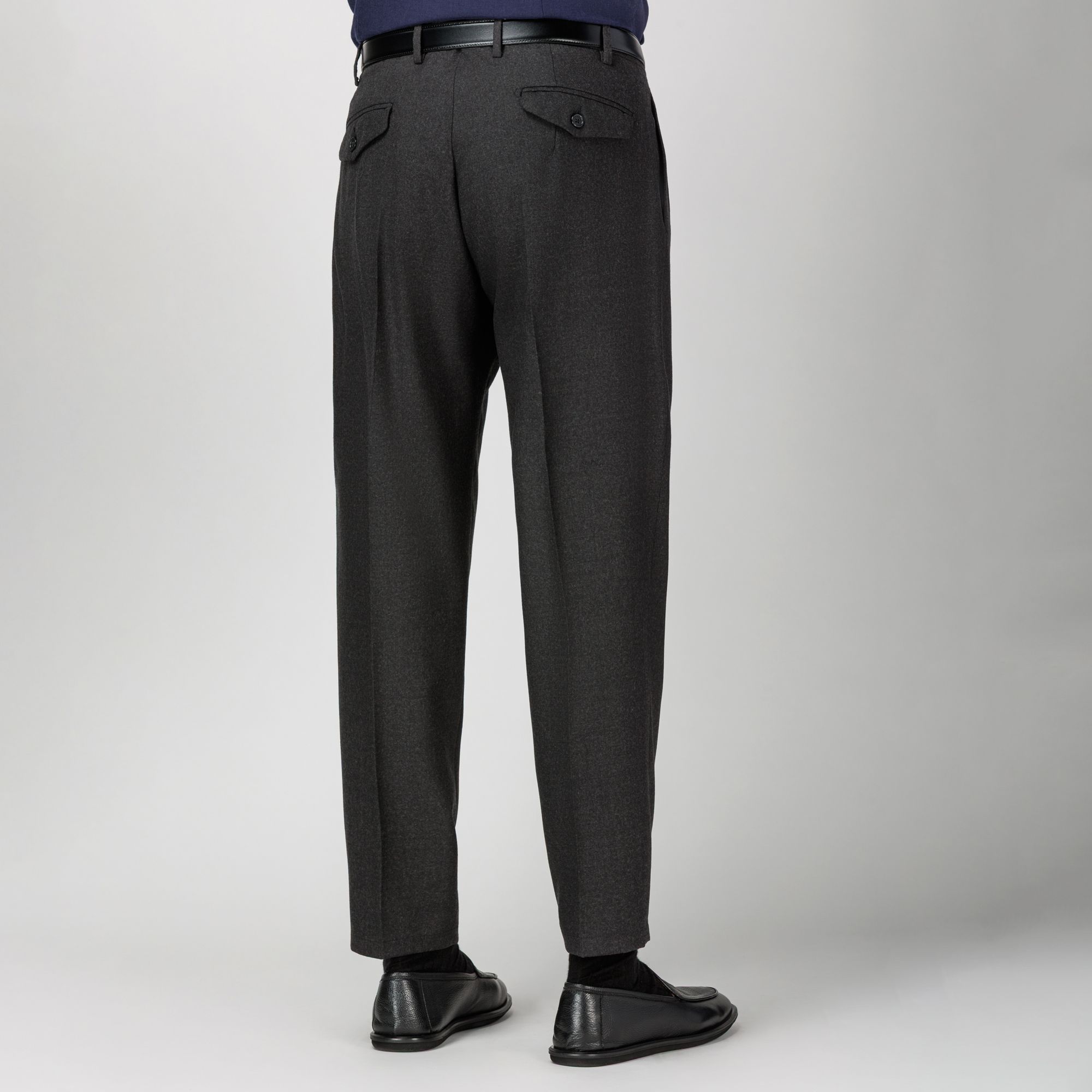 Men’s trousers in wool blend flannel, designed with a wide structured fit and double pleats. The Japan model features flap pocket details front and back and a cropped clean hem. A modern blend that is washable and wrinkle resistant, offering versatility from elegant to casual, with Elio Evan’s philosophy of flawless fit.