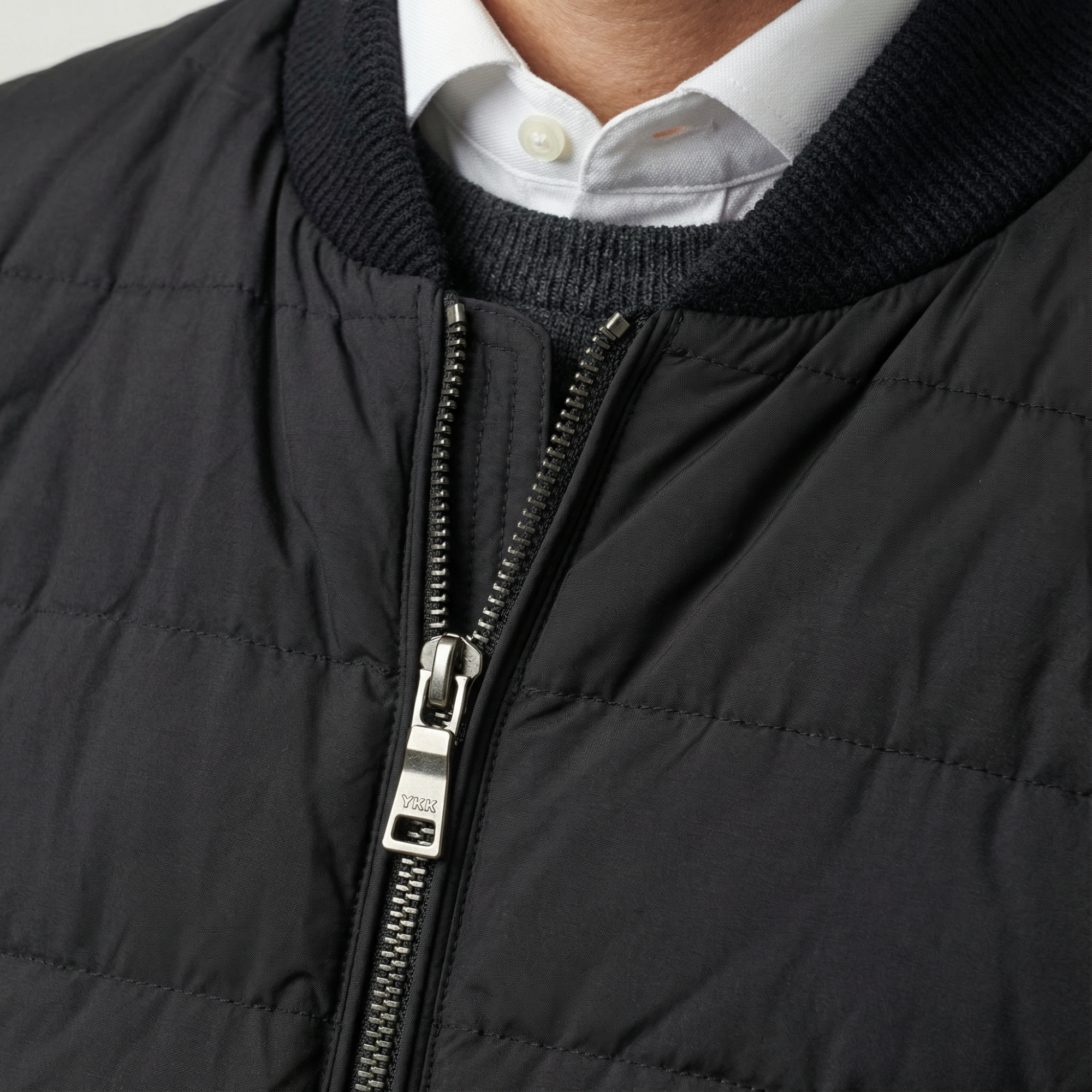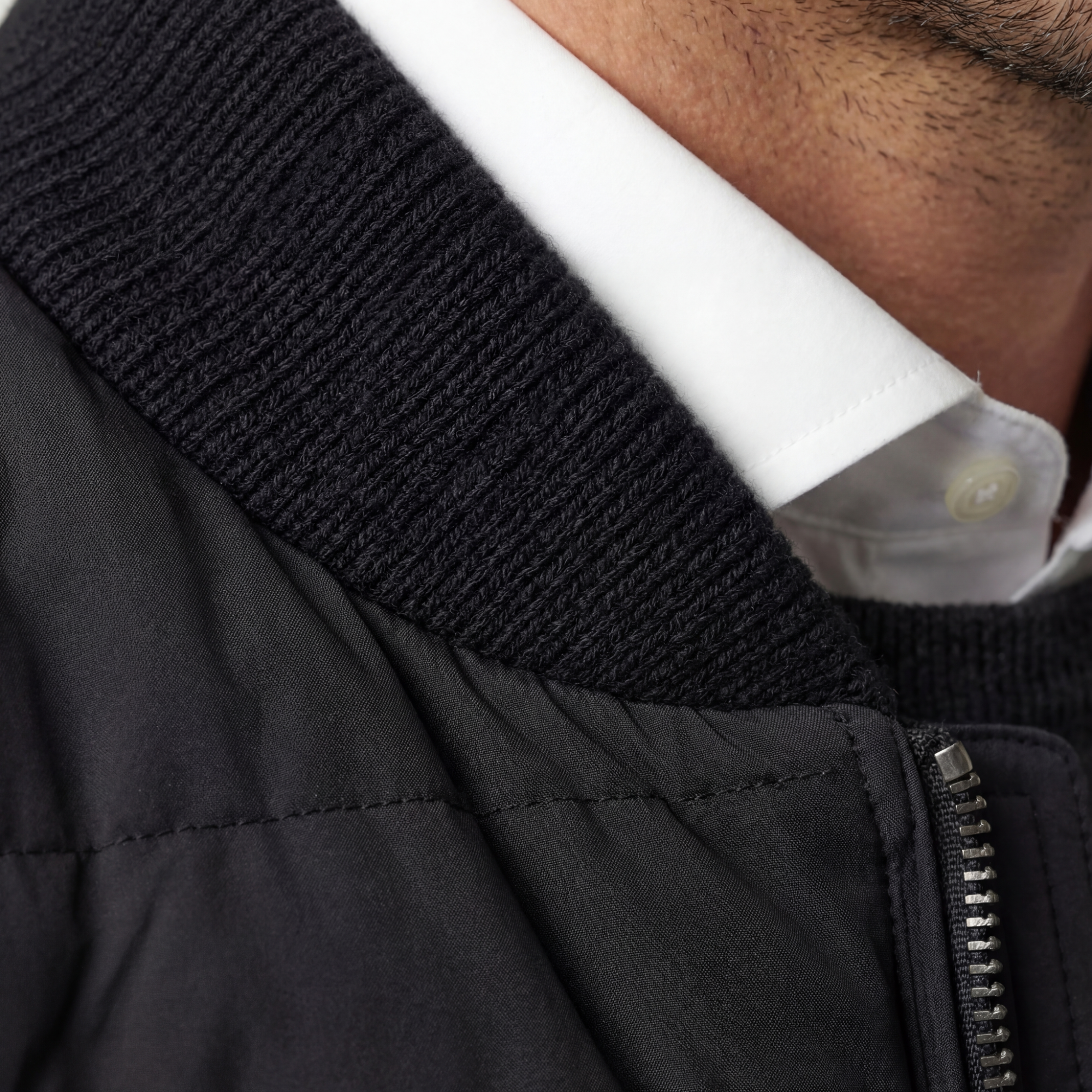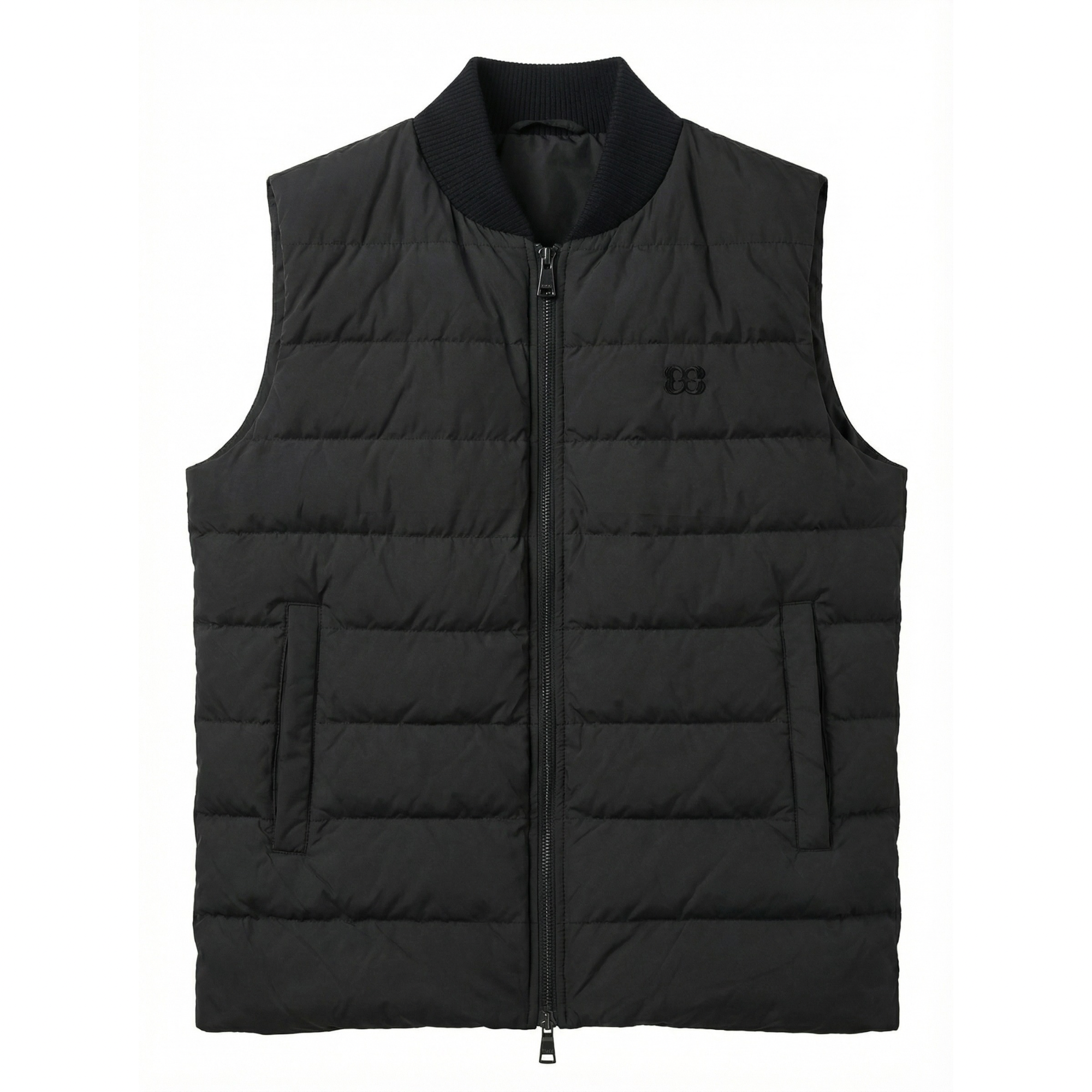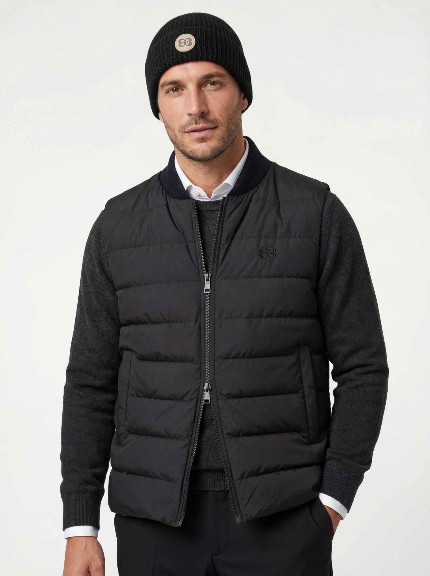 Created in the Elio Evan studio for modern urban layering, this down-filled vest blends protection and quiet elegance. The windproof and water-repellent Limonta fabric ensures comfort, while the 90/10 down filling delivers lightweight warmth. A ribbed knit collar adds structure and ease, making it suitable for both tailored and casual wardrobes.