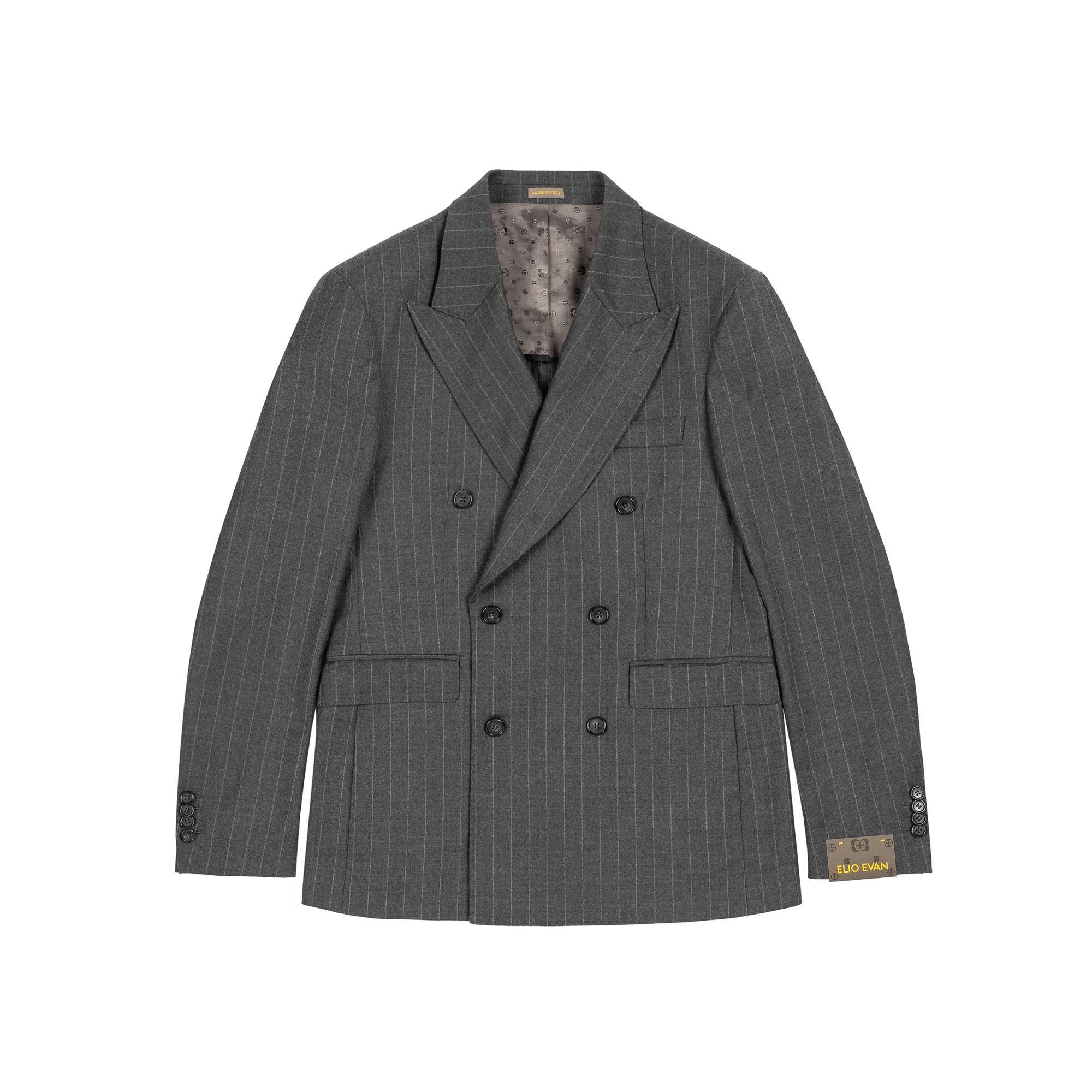 A refined men’s double-breasted blazer in grey pinstripe, tailored in the Vomero DP model — an expression of Elio Evan’s Italian unstructured elegance. Sculpted yet natural lines flow with ease, while the matte virgin wool-blend fabric offers quiet sophistication. Featuring peak lapels with AMF stitching, 6×2 button stance, and half-lining with the house’s signature pattern, it defines modern balance and timeless tailoring. Complete the look with the matching trousers for a full suit.