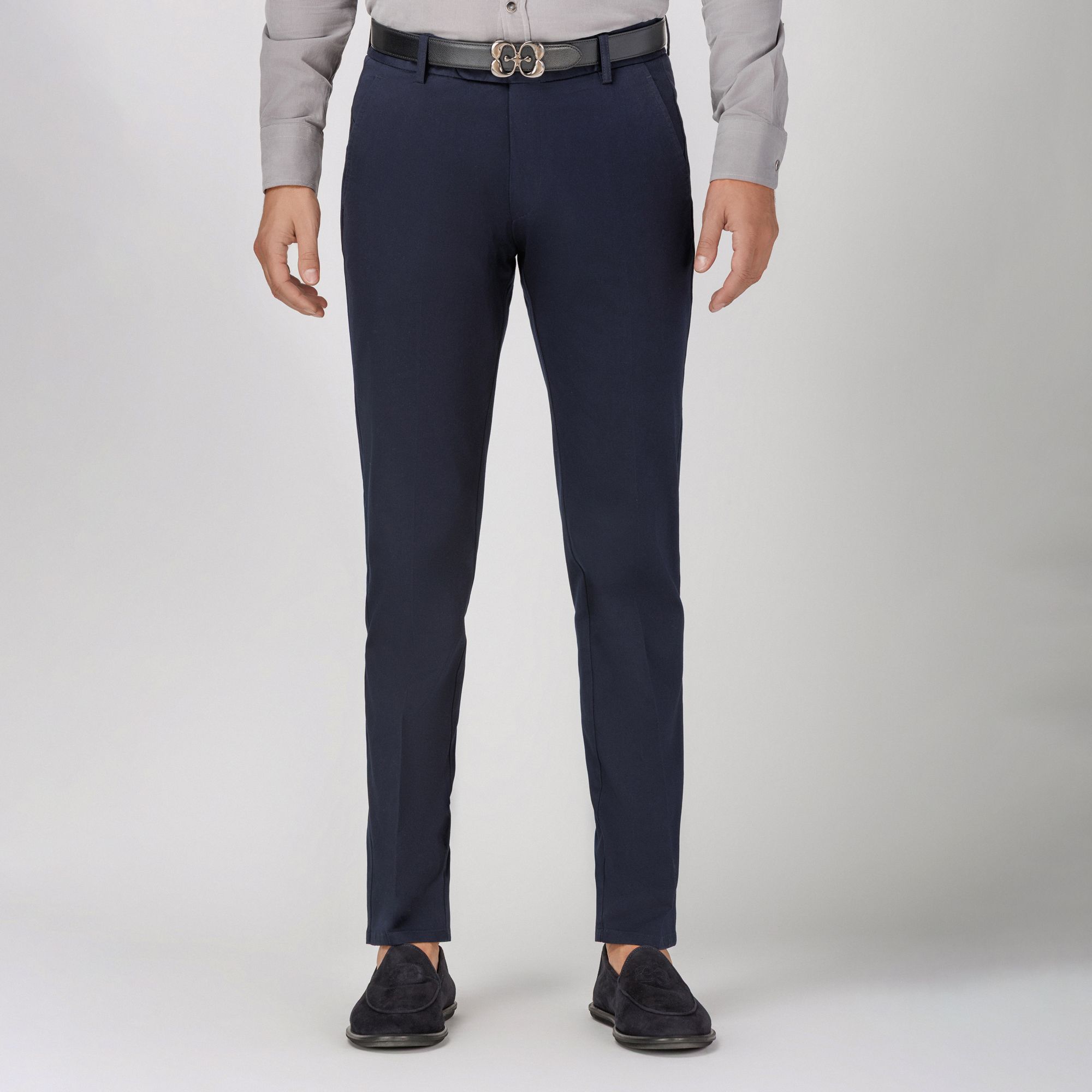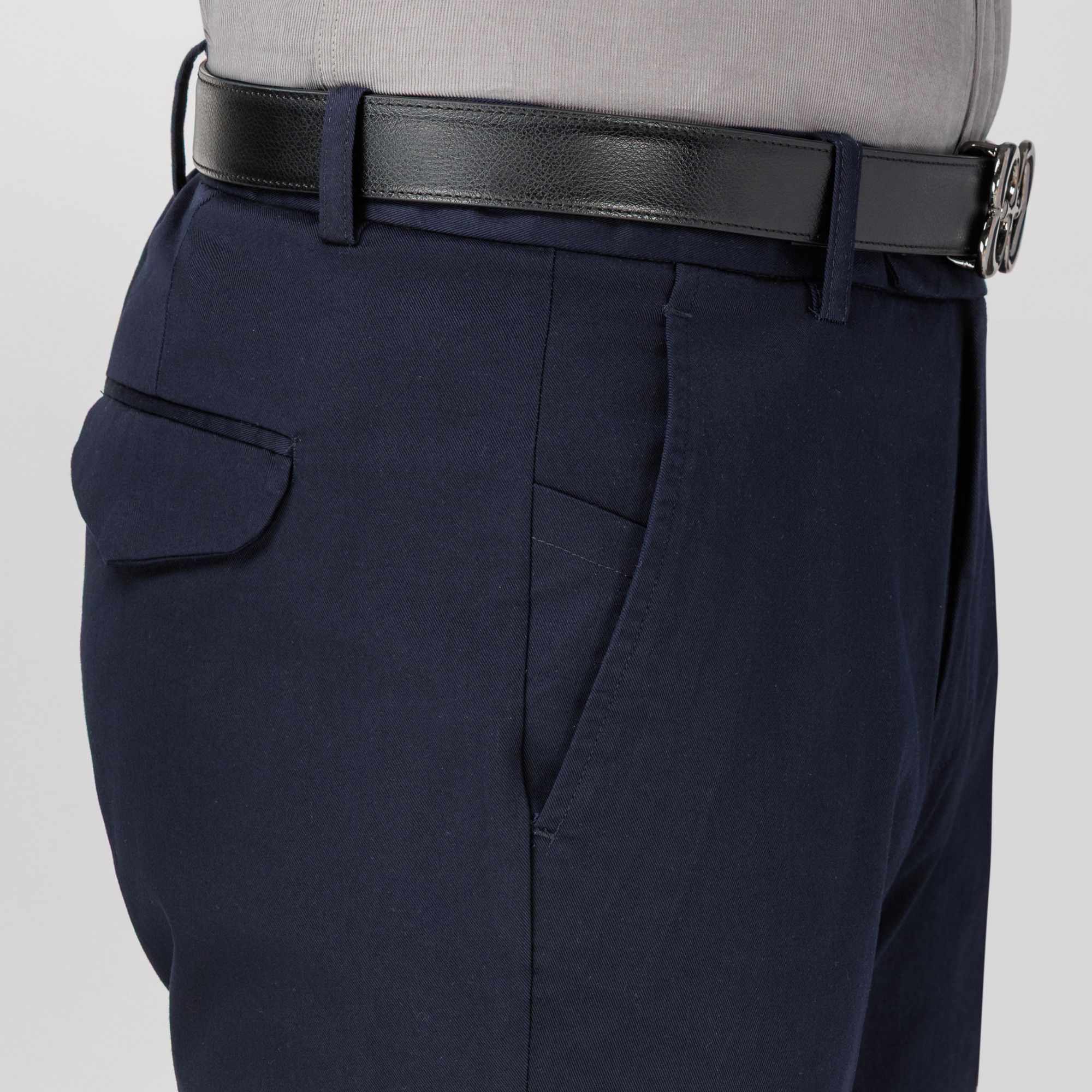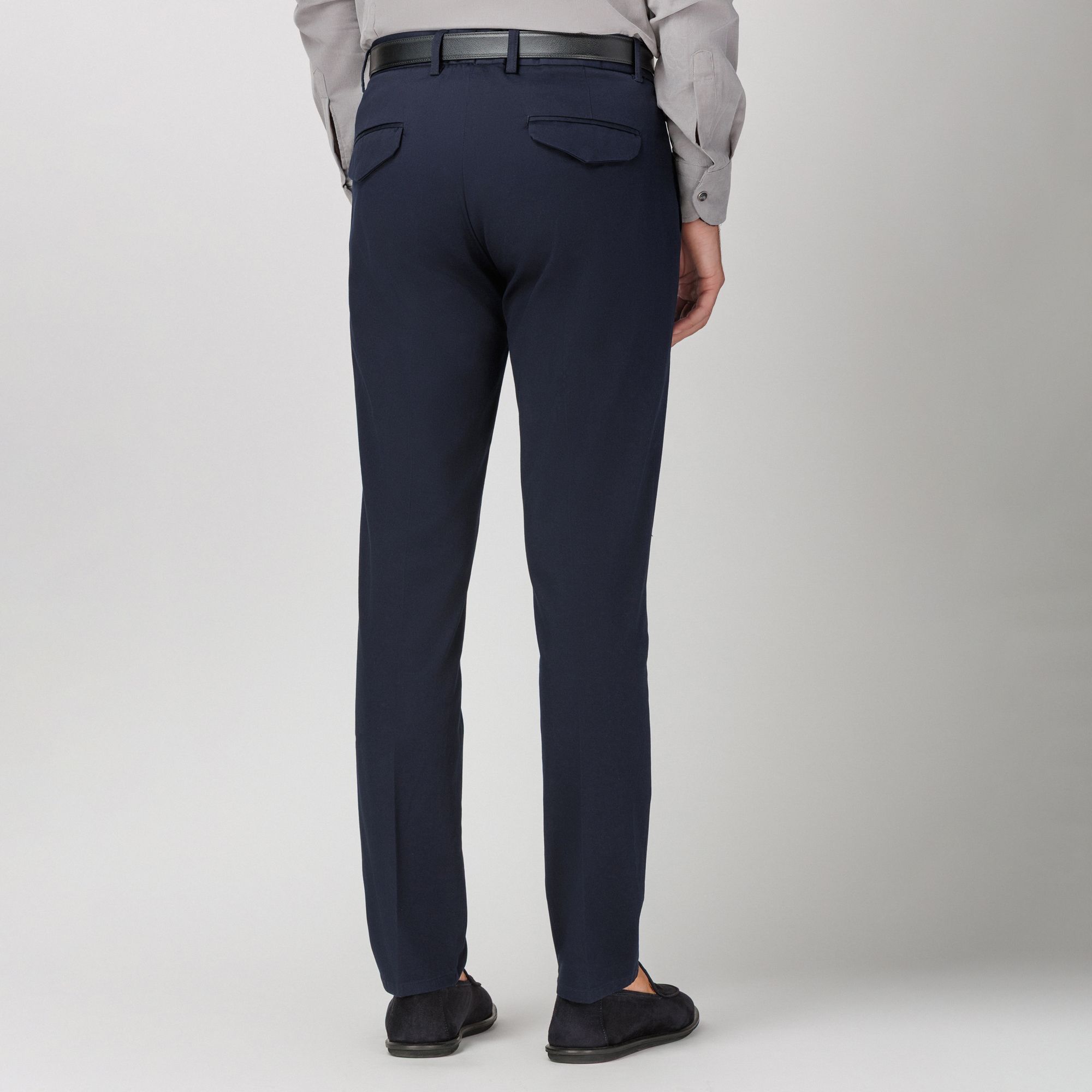 The Elio Evan studio presents a timeless navy chino trouser that blends refined tailoring with everyday comfort. Made from performance stretch cotton in a durable drill weave, it is washed for a soft, broken-in feel while preserving its sharp silhouette. Featuring an extended waistband tab, slanted side pockets, and back flap pockets with press-stud closure, it delivers both style and practicality. A flawless fit makes it an essential piece for versatile smart-casual dressing.