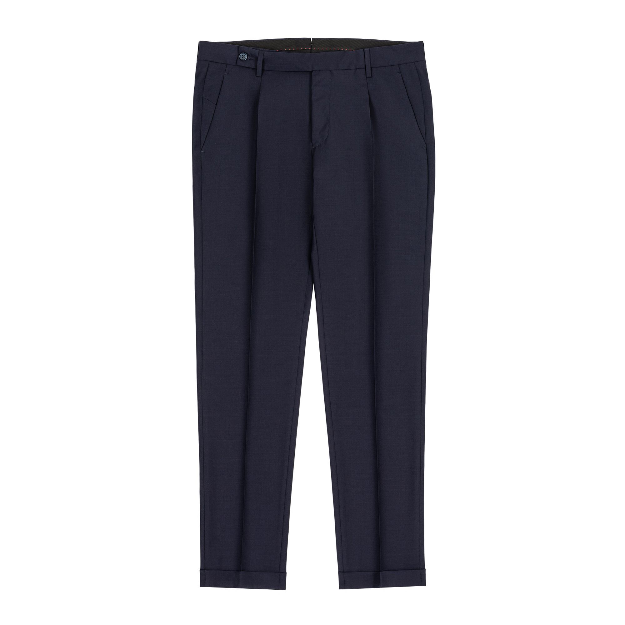 A refined business suit separate, this navy ensemble is crafted from 100% virgin cool wool, ensuring natural bistretch, crease resistance, and breathability. Featuring an unstructured blazer with a tailored fit and pleated trousers with an extended waistband, it’s the perfect choice for modern professionals. Made in Italy.