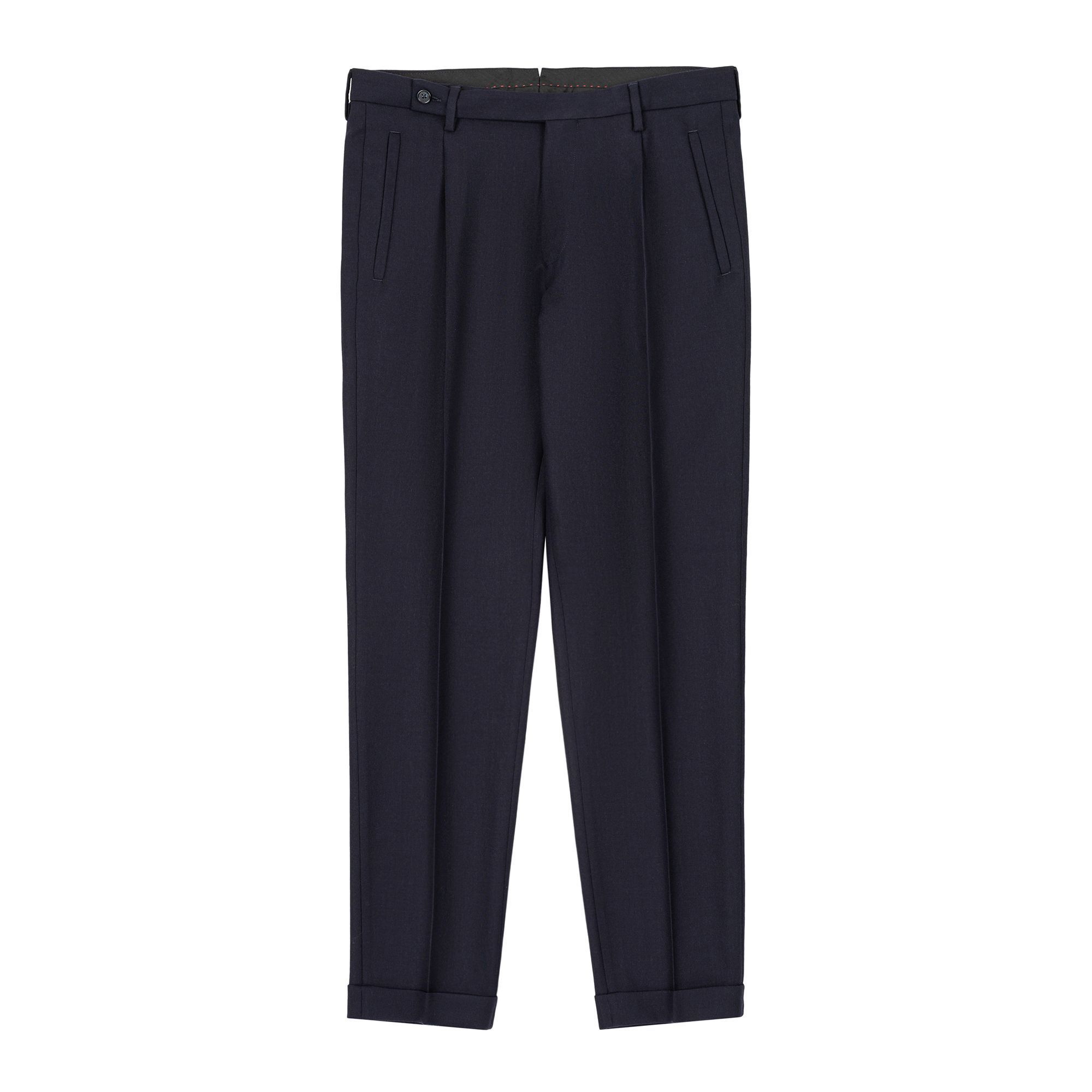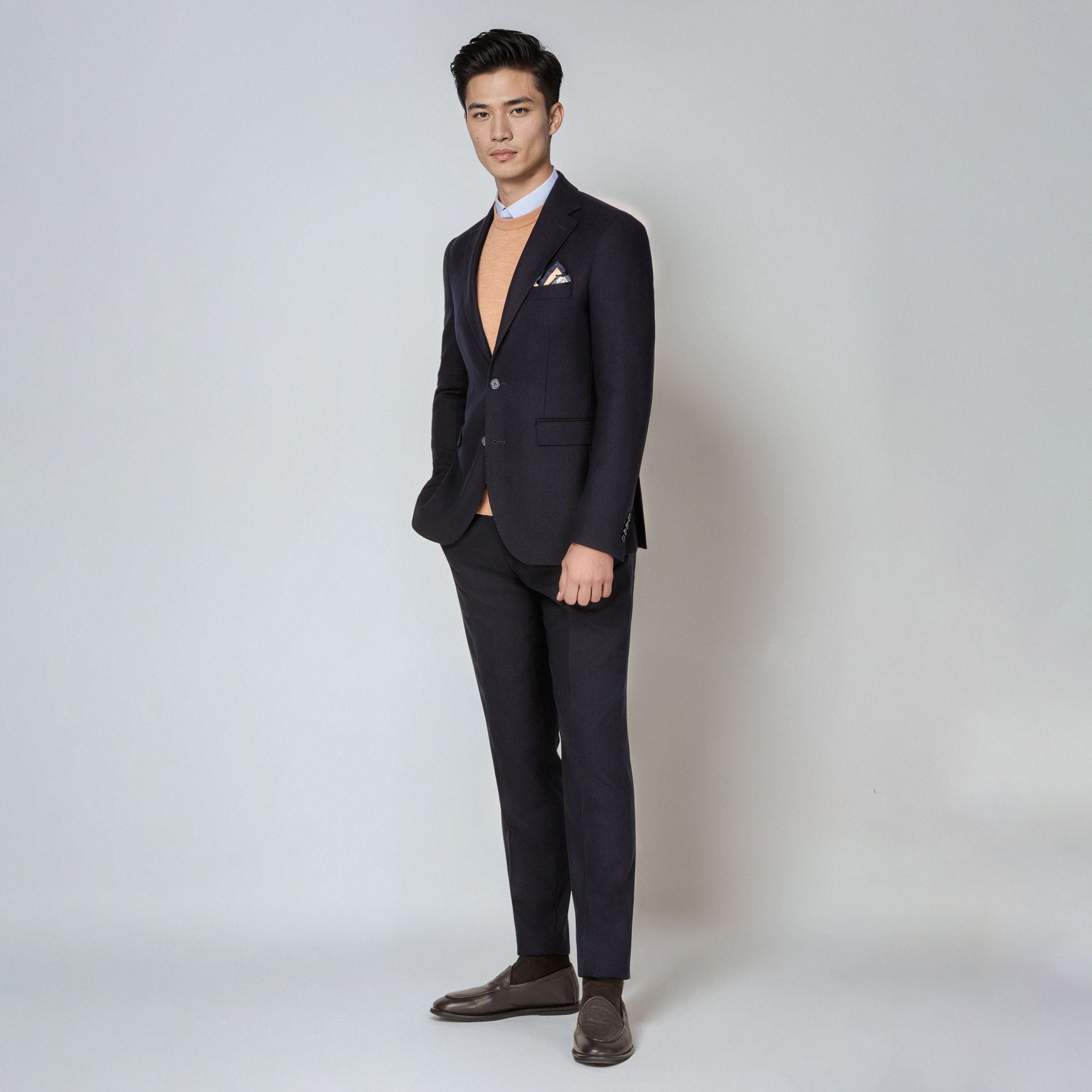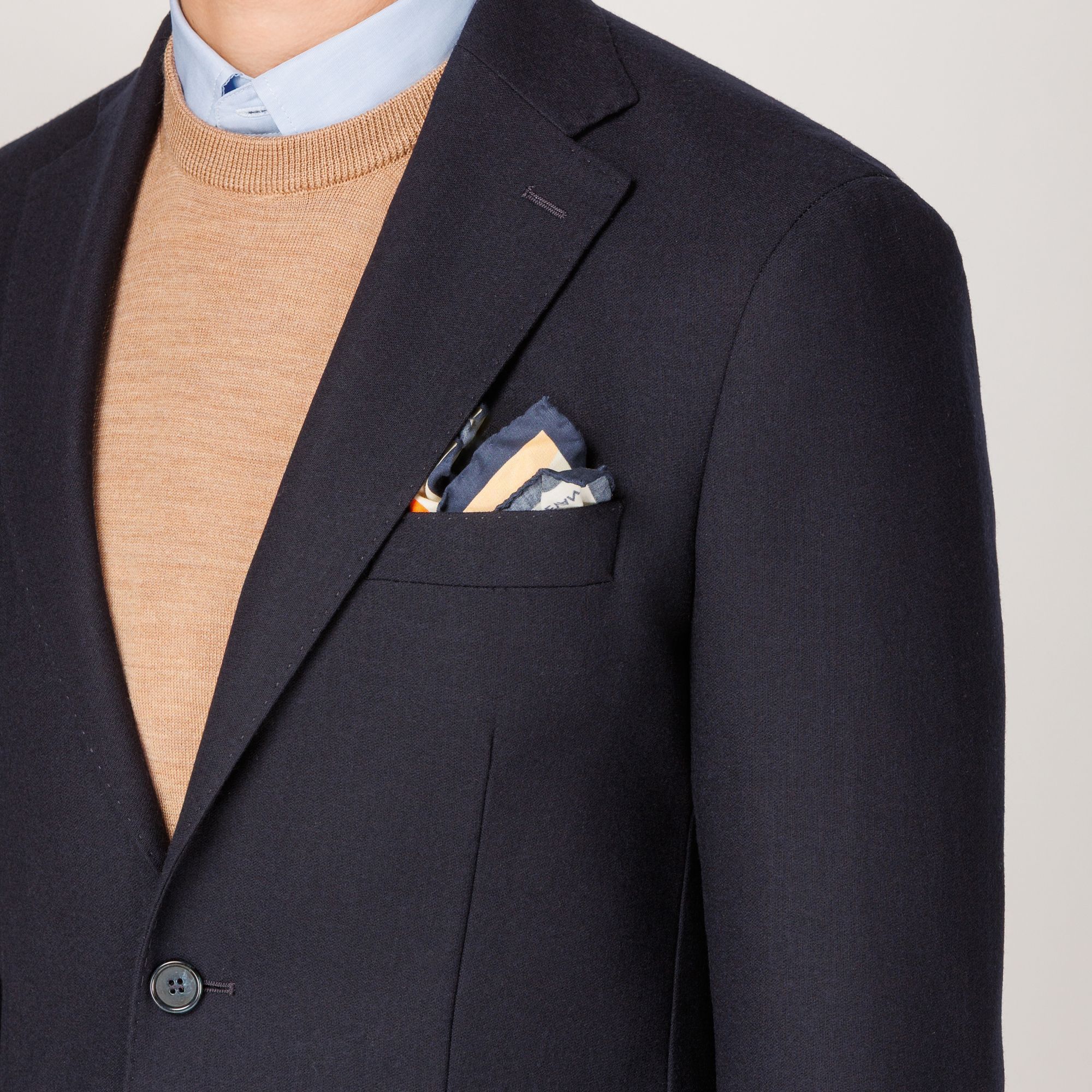 A refined men’s navy suit crafted from 100% virgin wool demi-crepe, featuring a soft brushed texture and fluid drape. The Vomero unconstructed blazer combines natural shoulders, classic notch lapels, and a light half-lining for exceptional comfort and movement. Matching single-pleat trousers complete the tailored silhouette — ideal for the modern gentleman seeking timeless Italian elegance. Made in Italy.