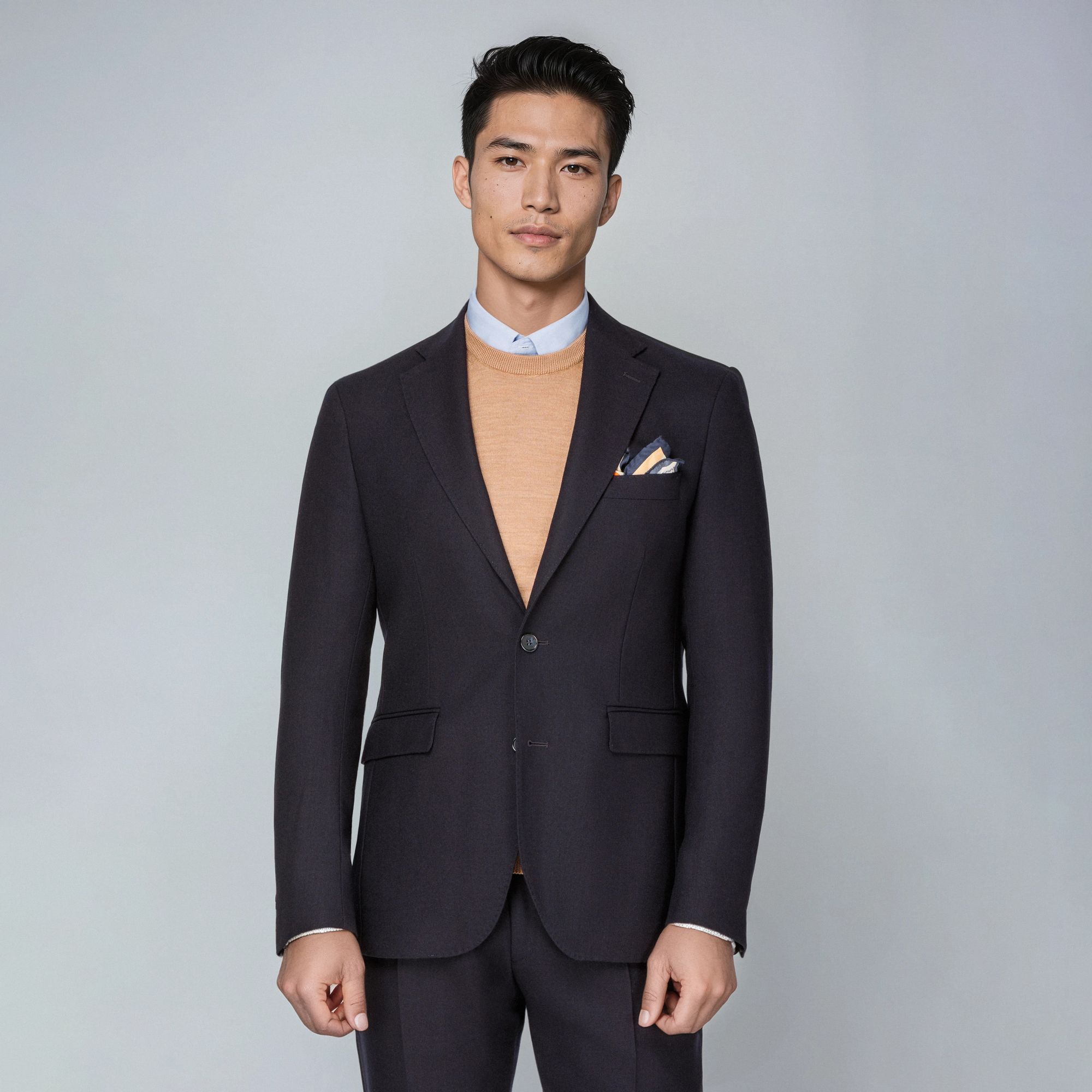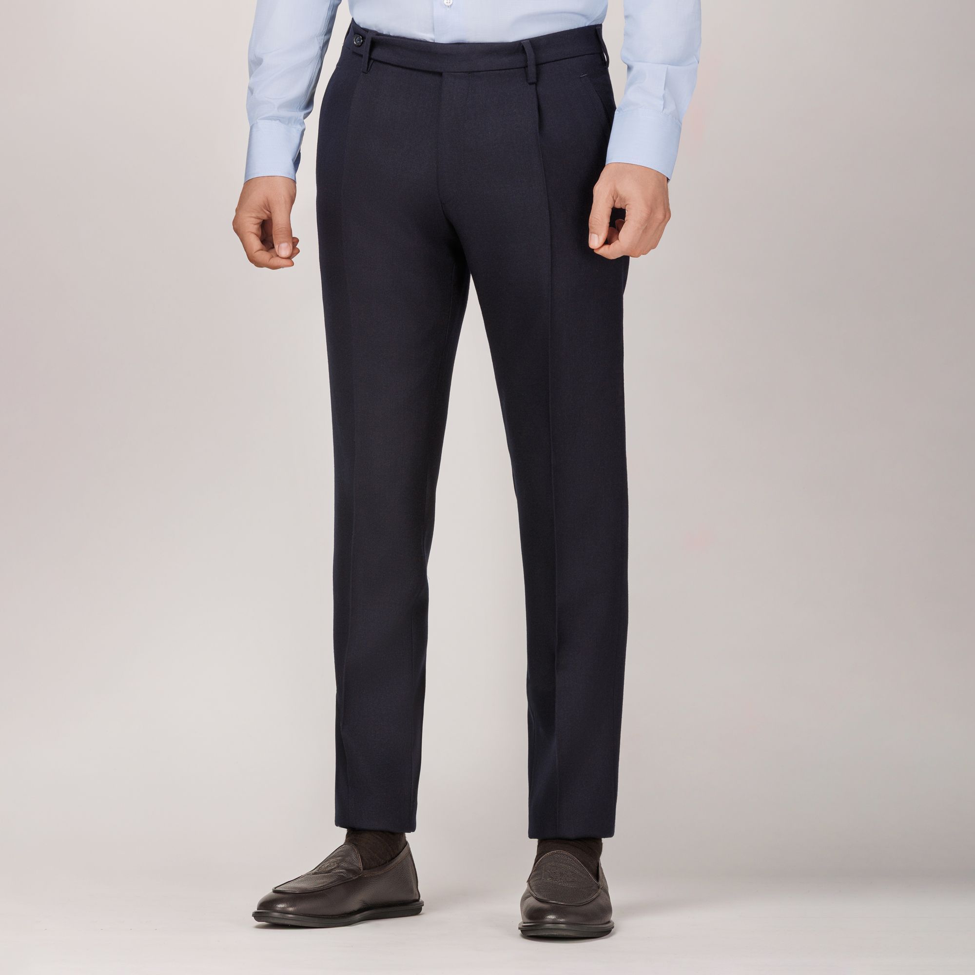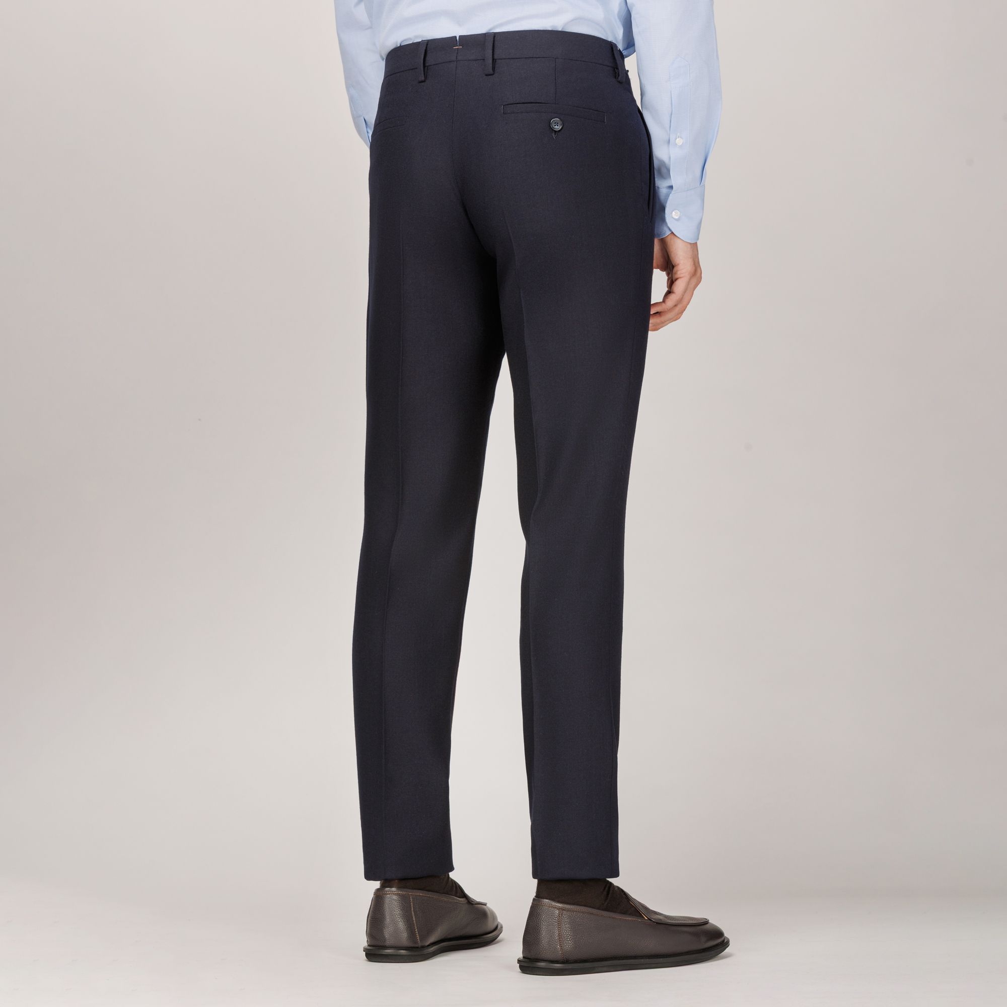 A refined men’s navy suit crafted from 100% virgin wool demi-crepe, featuring a soft brushed texture and fluid drape. The Vomero unconstructed blazer combines natural shoulders, classic notch lapels, and a light half-lining for exceptional comfort and movement. Matching single-pleat trousers complete the tailored silhouette — ideal for the modern gentleman seeking timeless Italian elegance. Made in Italy.