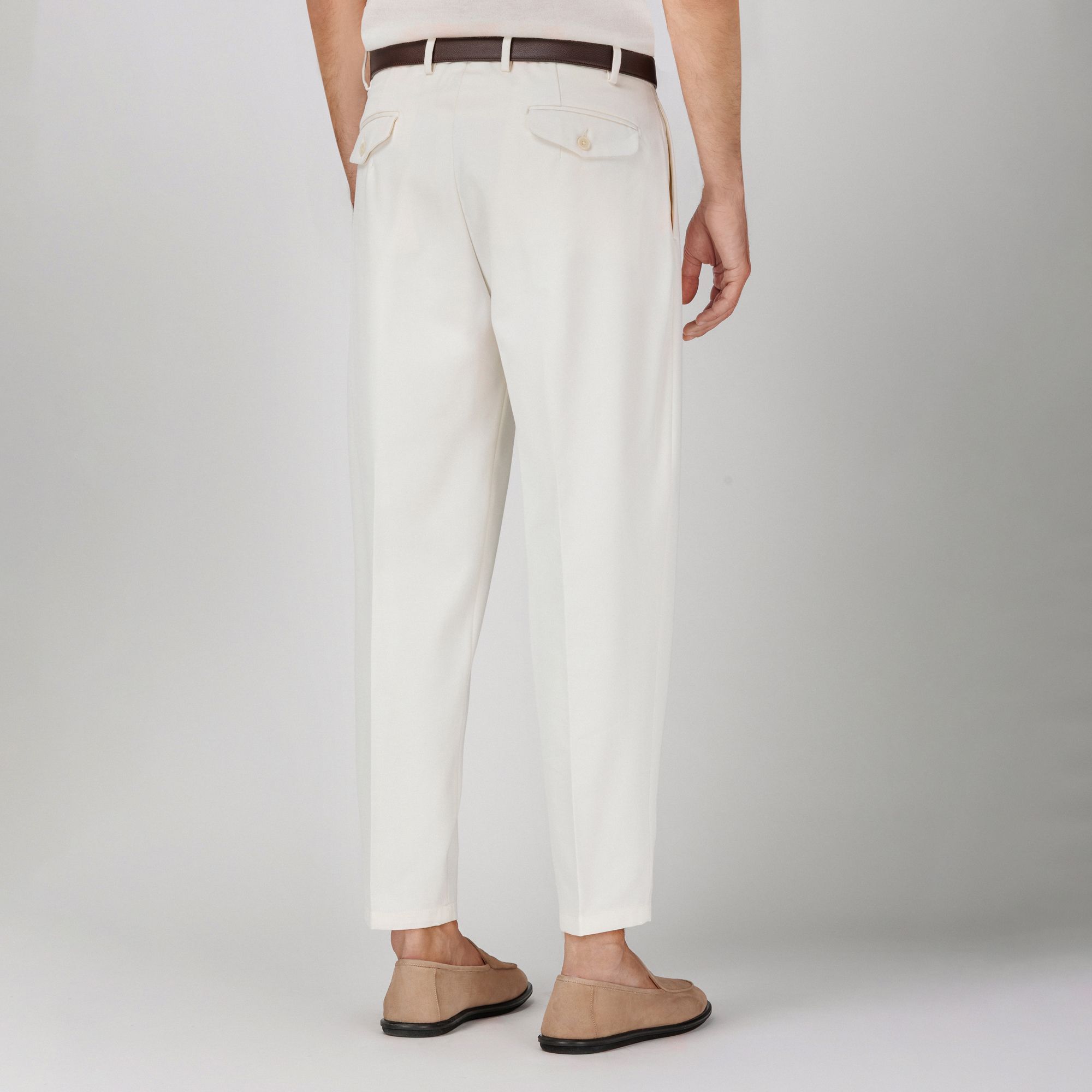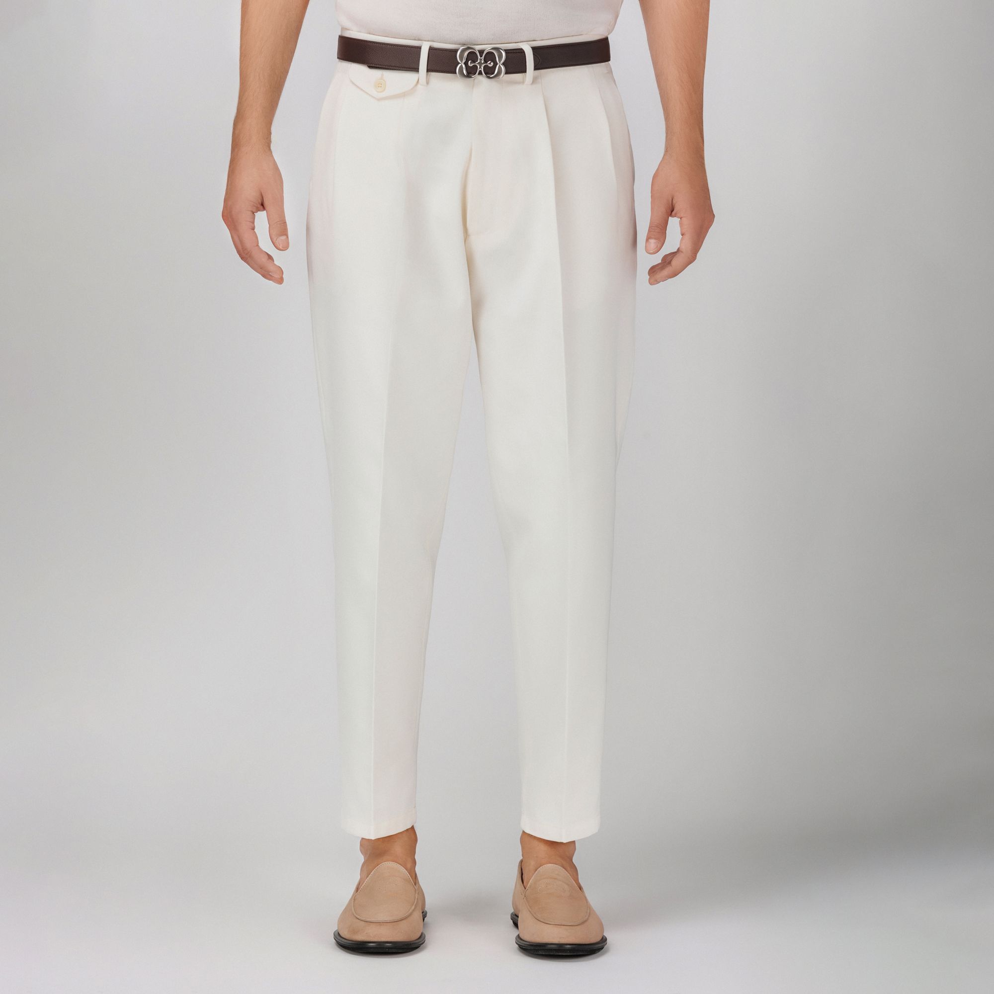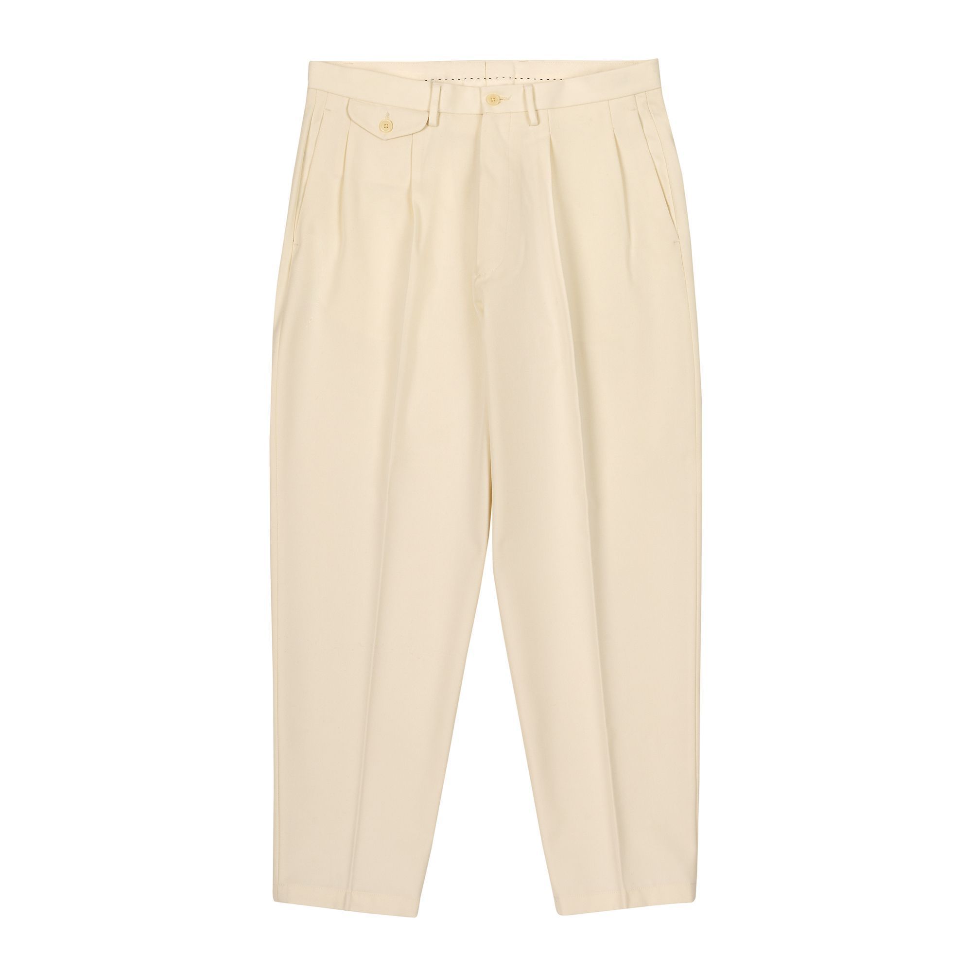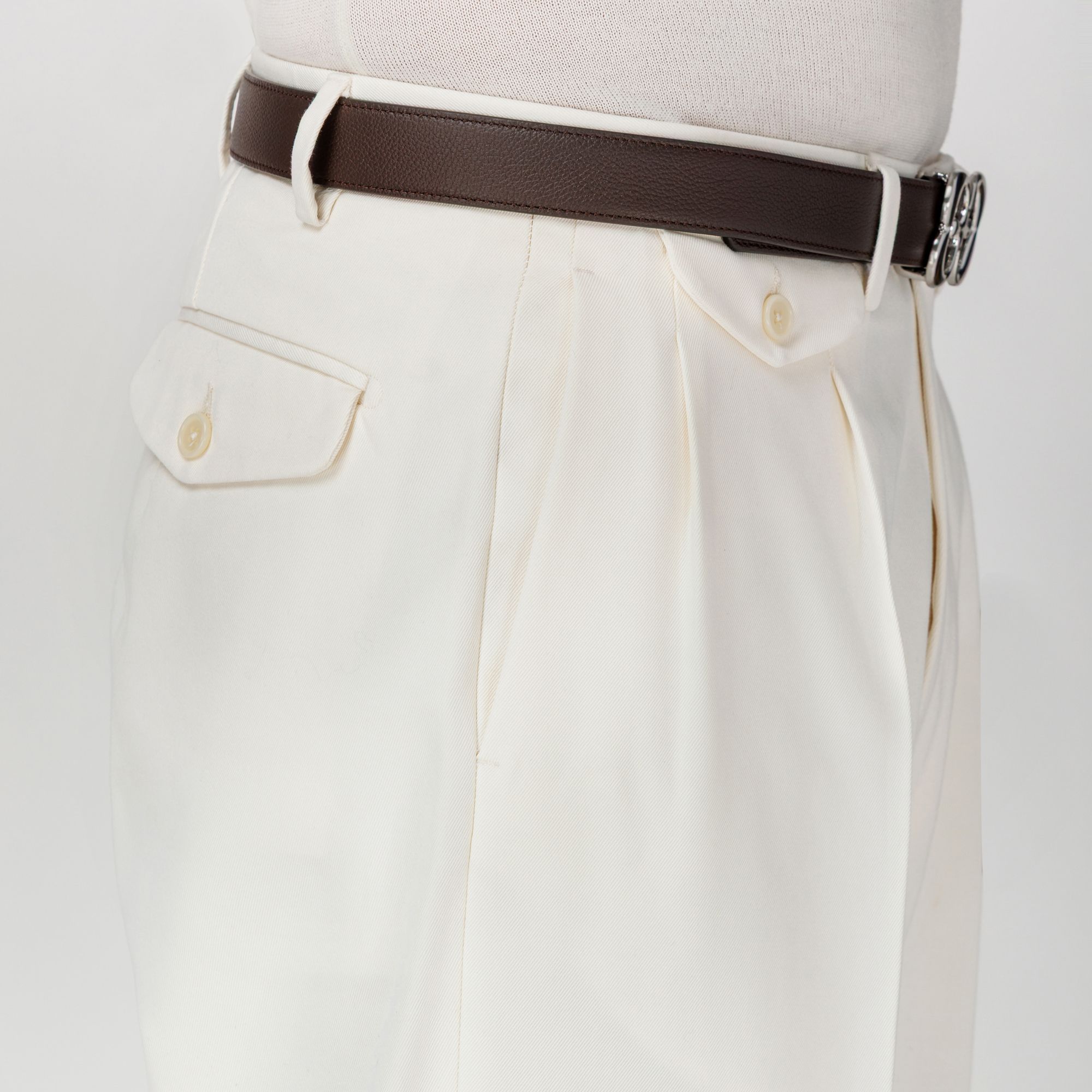 Crafted in Italy from virgin wool and pima cotton in a refined twill weave, these Elio Evan off white pants combine wrinkle resistance with washable practicality. The Japan wide fit model features a structured double pleat, flap pocket details front and back and clean hems. Designed for contemporary elegance, they offer superior comfort and a flawless fit in line with Elio Evan’s tailoring philosophy.
