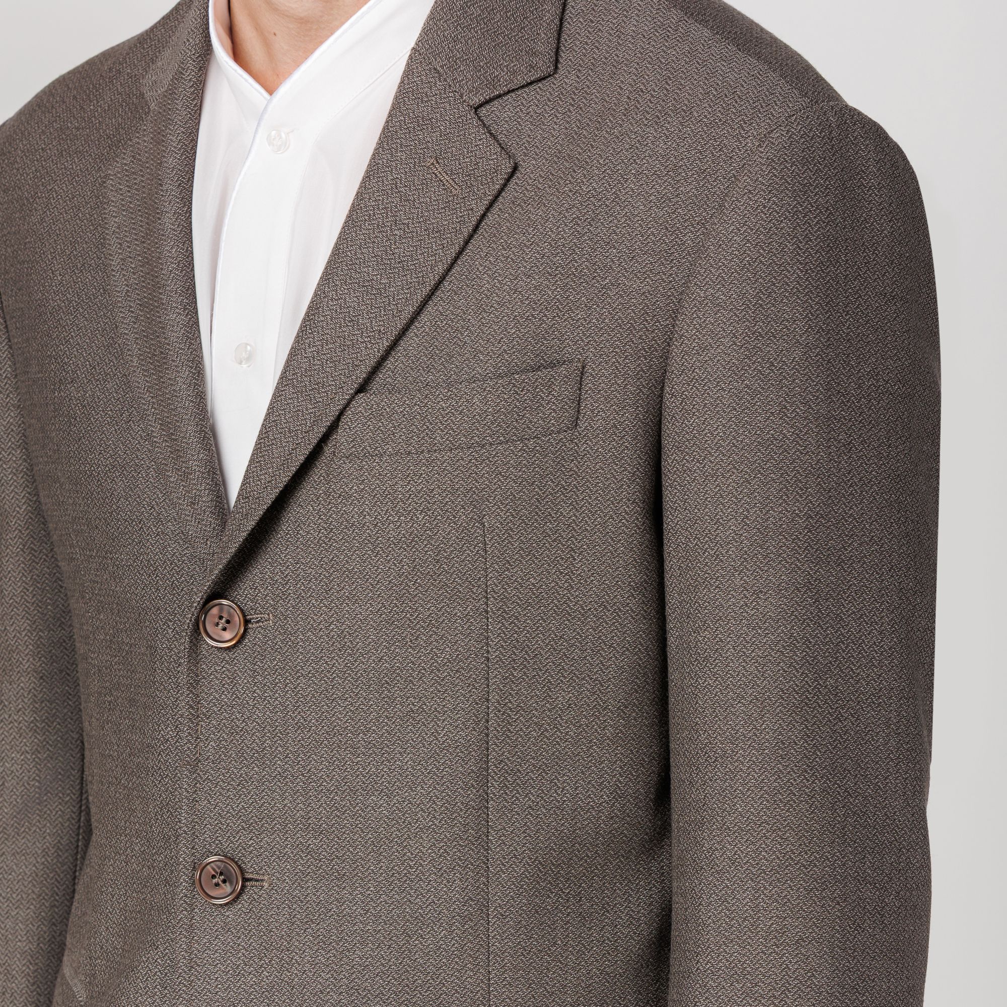 An elevated interpretation of modern Italian tailoring. This Elio Evan men’s suit is crafted from fine virgin wool woven with a taupe and grey micro herringbone pattern, combining understated elegance and natural drape. The jacket features soft shoulders, a three-button front rolled to two, and a half-lined interior for light structure and refined comfort. The matching trousers with a single pleat, extended waistband, and turn-ups complete a composition of modern sophistication and timeless style. A contemporary suit that captures the quiet confidence and effortless grace of the Elio Evan man. Key Features Composition: 100% Virgin Wool Colour: Taupe and Grey Micro Herringbone Jacket: Three-button rolled to two Half-lined with Elio Evan signature lining Natural shoulders, unstructured construction Trousers with single pleat, tailored waistband, turn-ups