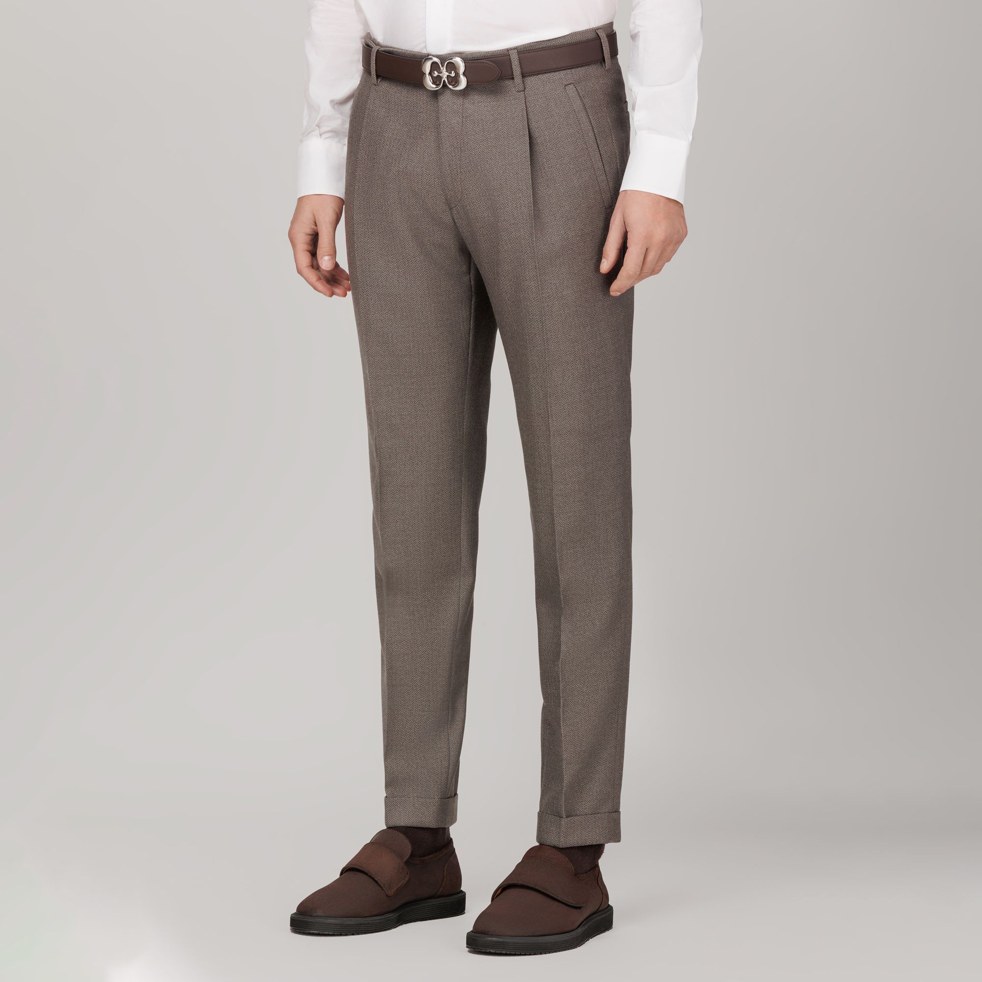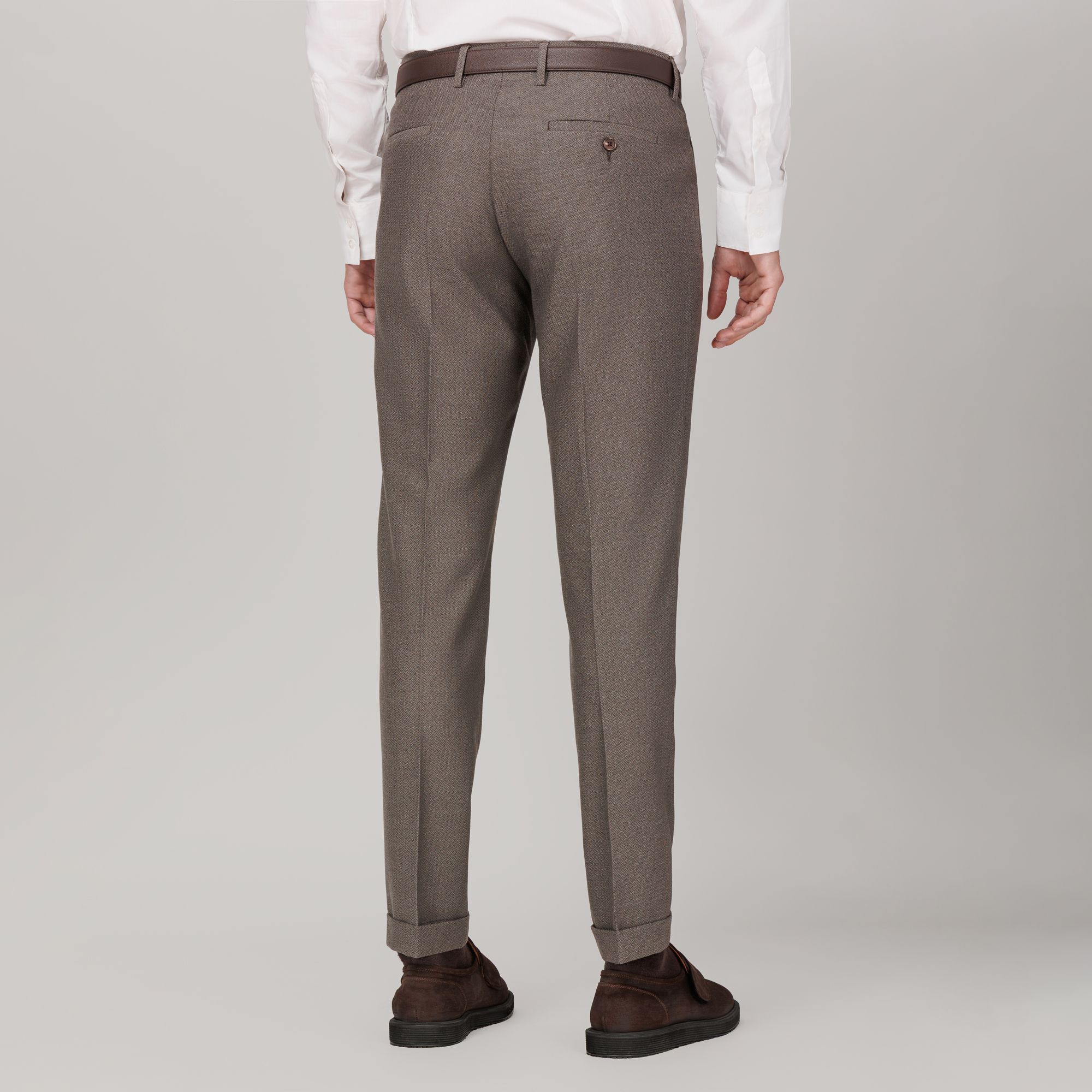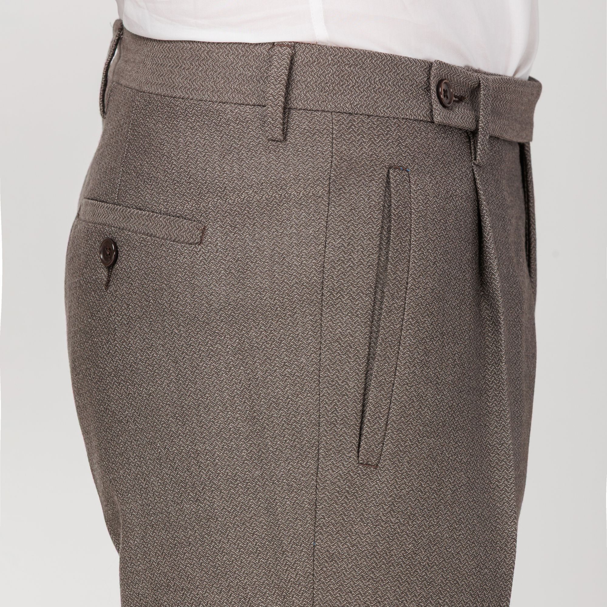 The Elio Evan Marnes 1P trousers in taupe micro herringbone wool express understated Italian elegance and craftsmanship. Tailored in Italy from 100% virgin wool, they combine structure and ease in perfect proportion.
