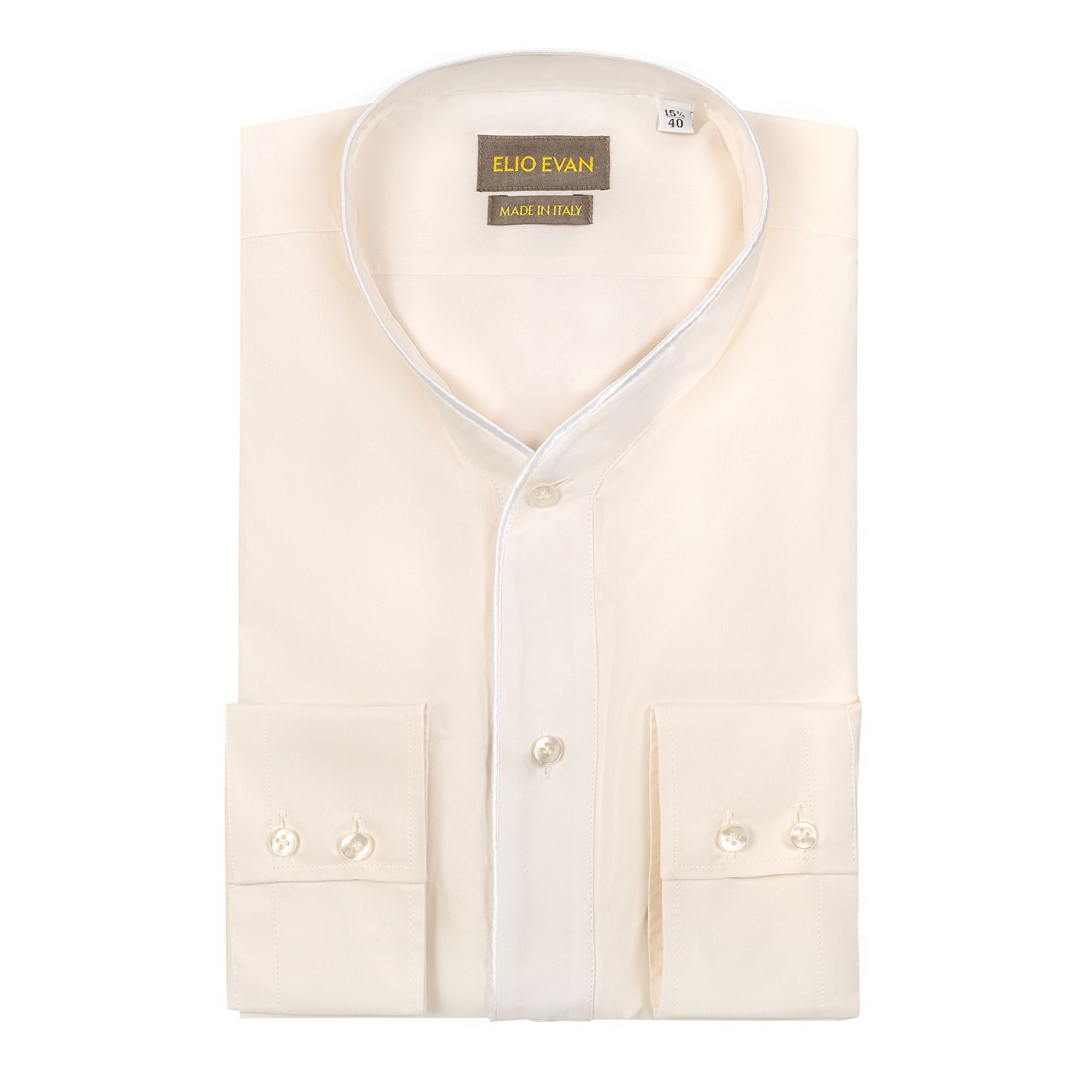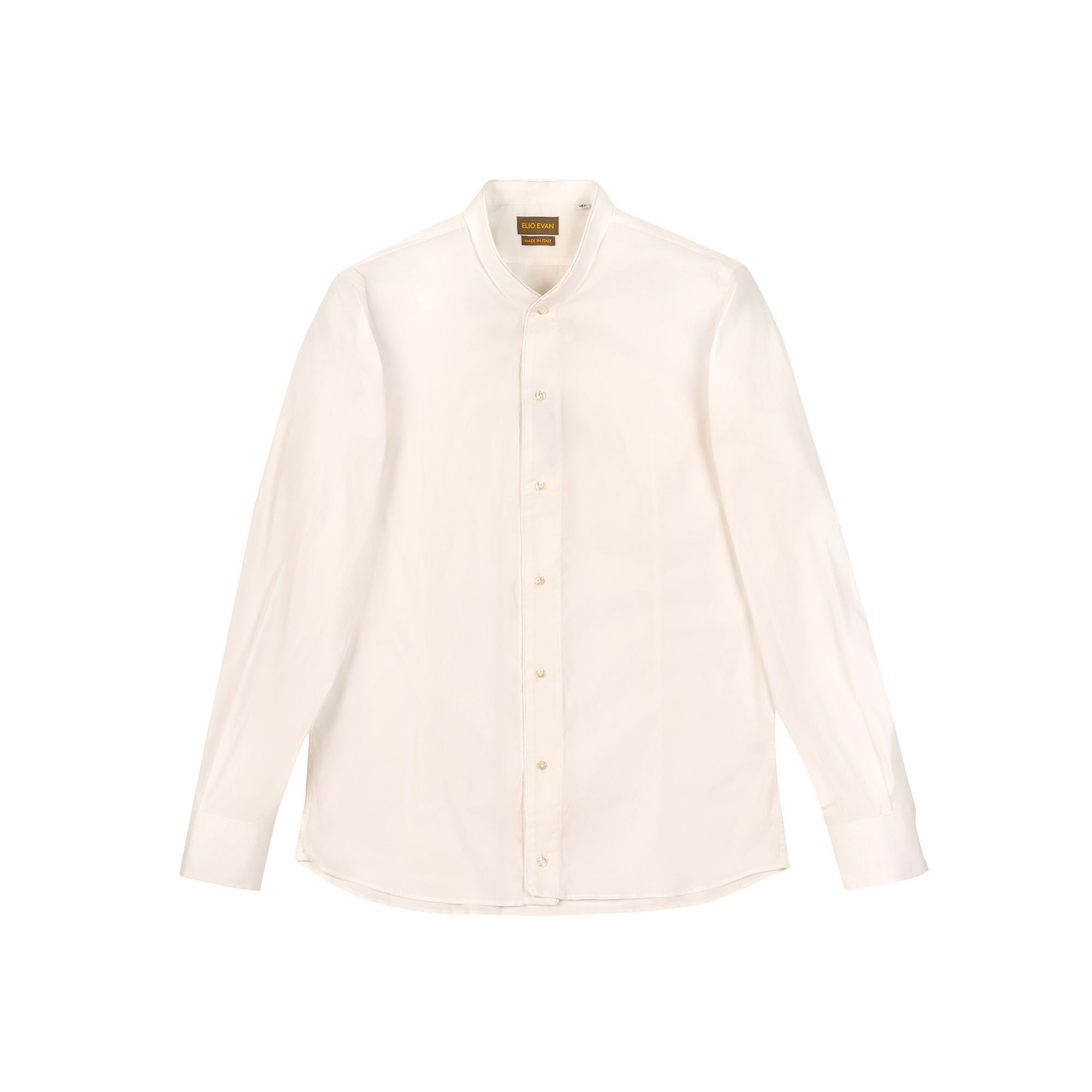 Refined and elevated, this white shirt by Elio Evan is cut from a luxurious silk-cotton blend that combines natural sheen with breathable structure. Crafted in Italy in the Nice model, it features a rounded band collar trimmed in satin piping, square cuffs with double-button closure, and a slightly curved hem for styling tucked or untucked. Single-needle stitching and mother-of-pearl buttons reflect a sartorial standard designed for modern sophistication.
